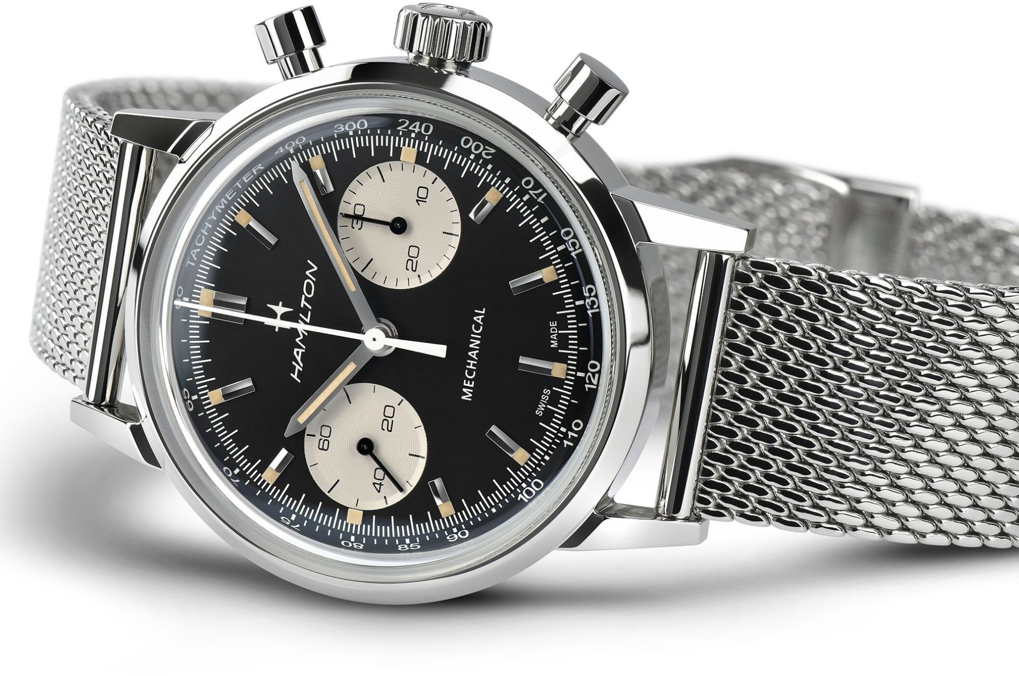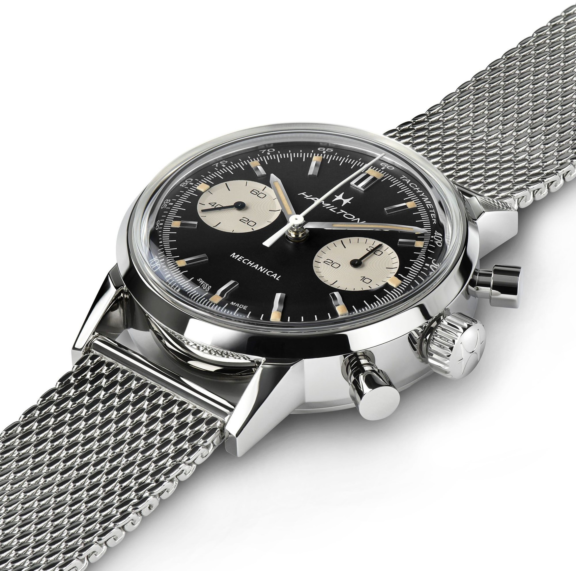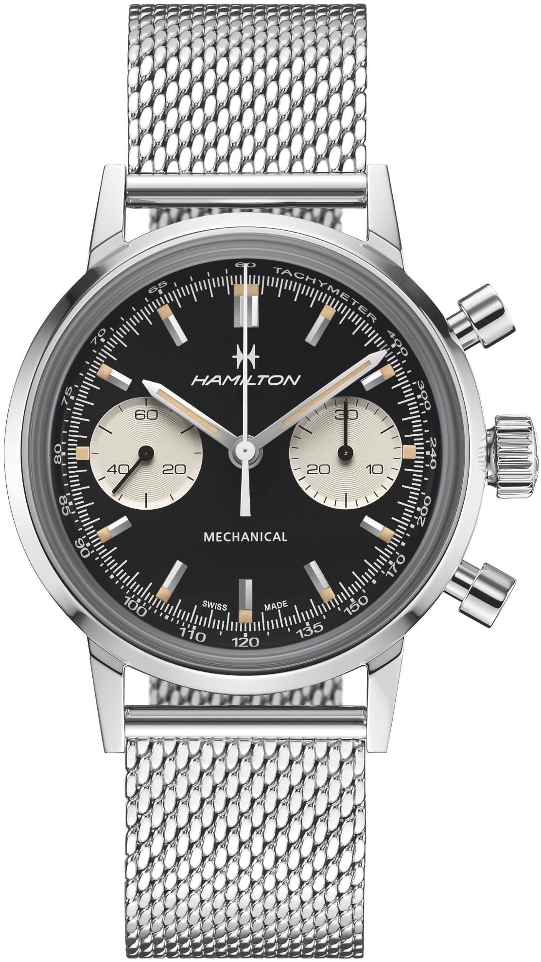 Hamilton American Classic Intra-Matic Chronograph H38429130 sind Herren-Mechanikuhren mit einem Milanaise-Edelstahlarmband und einer Klappschließe. Das Edelstahlgehäuse hat einen Durchmesser von 40 Millimetern. Das schwarze Zifferblatt mit zwei weißen Stoppuhr-Subzifferblättern und einer inneren Lünette mit Tachymeterskala wird von einem widerstandsfähigen Saphirglas mit Antireflexbeschichtung geschützt. Zeiger und Indizes sind mit einer lumineszierenden Super-LumiNova® Beschichtung versehen, die perfekte Ablesbarkeit bei schlechten Lichtverhältnissen garantiert. Der Antrieb der Uhr erfolgt durch ein mechanisches Kaliber H-51 mit Handaufzug und einer Gangreserve von 60 Stunden. Mit einer Wasserdichtigkeit von 10 ATM sind die Uhren für Schwimmen und Schnorcheln geeignet.