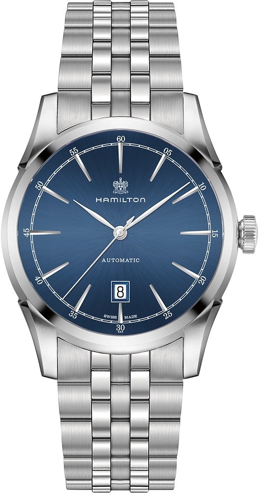 Hamilton American Classic Spirit of Liberty H42415041 sind klassische Herren-Automatikuhr mit einem Edelstahlarmband mit Faltschließe. Das Edelstahlgehäuse hat einen Durchmesser von 42 Millimetern und einen transparenten Gehäuseboden. Das blaue Zifferblatt mit Sonnenschliff und Datumsanzeige auf sechs Uhr wird durch ein robustes saphirbeschichtetes Glas geschützt. Der Antrieb der Uhr erfolgt durch ein mechanisches H-10 Uhrwerk mit automatischem Aufzug und einer Gangreserve von 80 Stunden. Mit einer Wasserdichtigkeit von 5 ATM ist die Uhr regen- und duschfest.