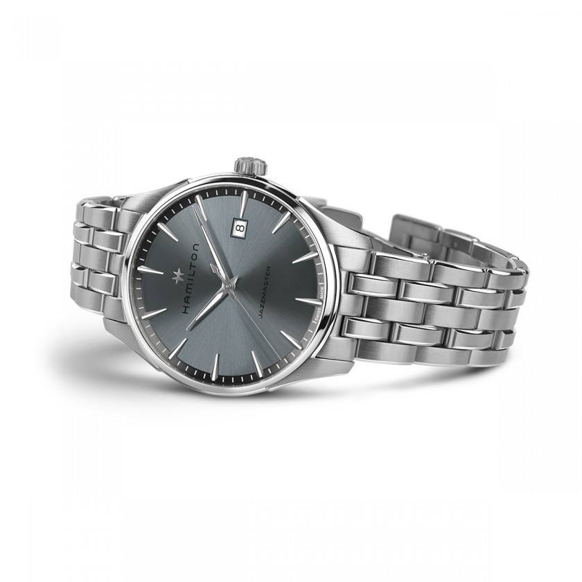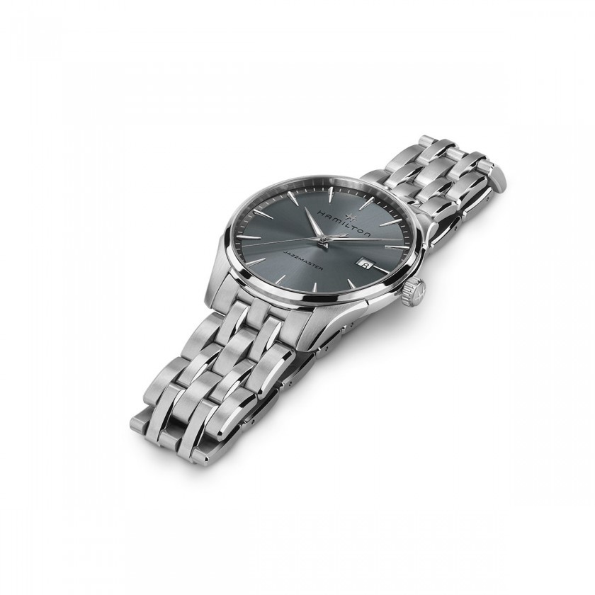 Hamilton Jazzmaster Quartz H32451142 sind Herren-Quarzuhren im klassischen Stil mit einem Edelstahlarmband und einer Schmetterlingsschließe. Das Edelstahlgehäuse hat einen Durchmesser von 40 Millimetern. Das blau-graue Zifferblatt mit Sonnenschliff-Effekt und Datumsanzeige auf der Drei-Uhr-Position ist durch ein widerstandsfähiges Saphirglas geschützt. Die Zeiger und Indizes sind mit einer lumineszierenden Super-LumiNova®-Beschichtung versehen, die eine perfekte Ablesbarkeit bei schlechten Lichtverhältnissen garantiert. Der Antrieb der Uhr wird durch ein Quarzwerk ETA F06.111 gewährleistet. Mit einer Wasserdichtigkeit von 5 ATM ist die Uhr regen- und duschfest.