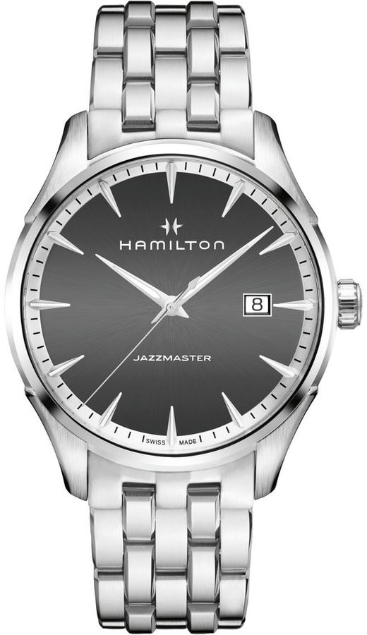 Hamilton Jazzmaster Quartz H32451181 sind Herren-Quarzuhren im klassischen Stil mit einem Stahlarmband und einer Faltschließe. Das Edelstahlgehäuse hat einen Durchmesser von 40 Millimetern. Das anthrazitfarbene Zifferblatt mit Sonnenschliff-Effekt und Datumsanzeige auf der Drei-Uhr-Position wird durch ein widerstandsfähiges saphirglas geschützt. Die Zeiger und Indizes sind mit einer Super-LumiNova®-Leuchtbeschichtung versehen, die eine perfekte Ablesbarkeit bei schlechten Lichtverhältnissen garantiert. Der Antrieb der Uhr wird durch ein Quarzwerk ETA F06.111 gewährleistet. Mit einer Wasserdichtigkeit von 5 ATM ist die Uhr regen- und duschfest.