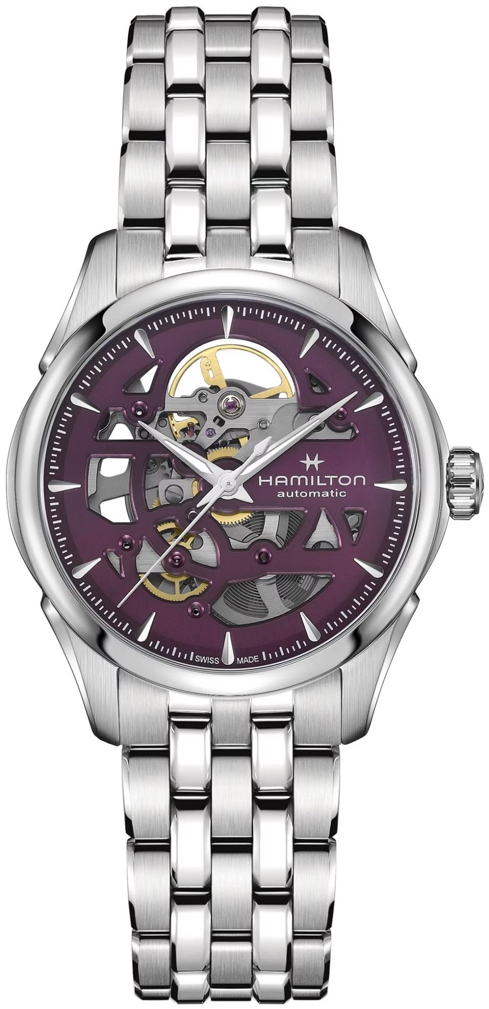 Die Hamilton Jazzmaster Skeleton H32265101 sind Damen-Automatikuhr im klassischen Stil mit einem Edelstahlarmband und einer Faltschließe. Das Edelstahlgehäuse hat einen Durchmesser von 36 Millimetern und einen transparenten Gehäuseboden. Das violette Skelett-Zifferblatt wird durch ein widerstandsfähiges Saphirglas mit Antireflexbeschichtung geschützt. Die Zeiger sind mit einer lumineszierenden Beschichtung Super-LumiNova® versehen, die eine perfekte Ablesbarkeit bei schlechten Lichtverhältnissen garantiert. Der Antrieb der Uhr erfolgt durch ein mechanisches Werk H-10-S mit automatischem Aufzug und einer Gangreserve von 80 Stunden. Mit einer Wasserdichtigkeit von 5 ATM ist die Uhr gegen Regen und beim Duschen geschützt.