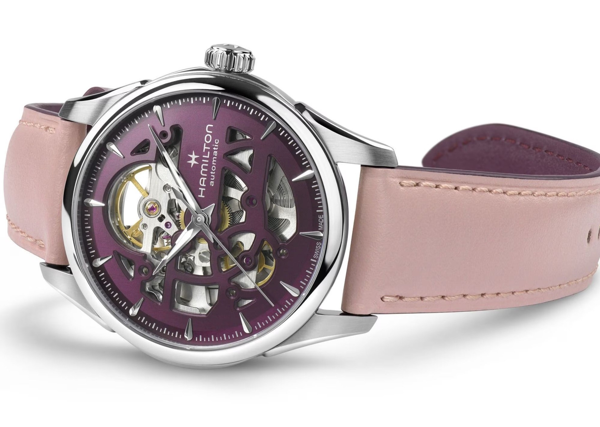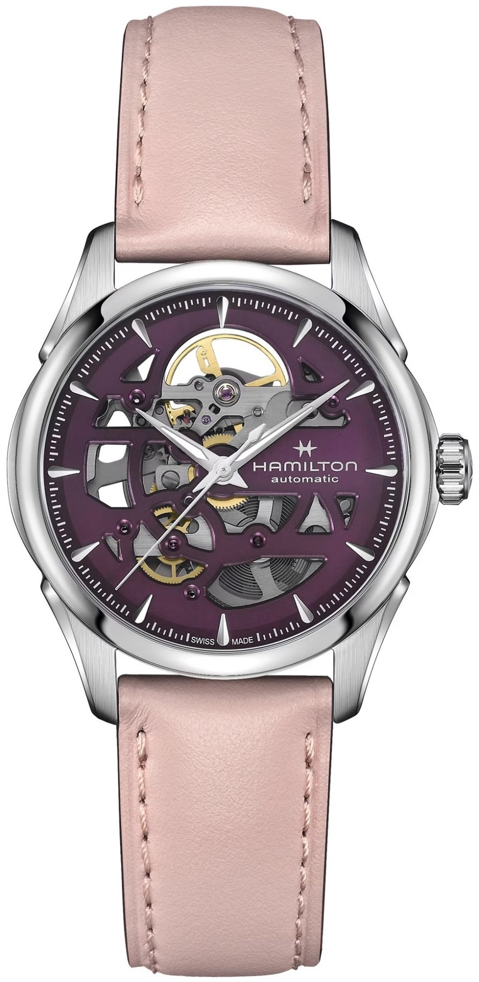 Hamilton Jazzmaster Skeleton H32265801 sind elegante Damen-Automatikuhr mit einem rosafarbenen Lederarmband und einer Dornschließe. Das Edelstahlgehäuse hat einen Durchmesser von 36 Millimetern und einen transparenten Gehäuseboden. Das violette Skelettzifferblatt wird durch ein robustes saphirglas mit Antireflexbeschichtung geschützt. Die Zeiger sind mit einer lumineszierenden Beschichtung Super-LumiNova® versehen, die eine perfekte Ablesbarkeit bei schlechten Lichtverhältnissen garantiert. Das Uhrwerk wird durch ein mechanisches Kaliber H-10-S mit automatischem Aufzug und einer Gangreserve von 80 Stunden angetrieben. Mit einer Wasserdichtigkeit von 5 ATM ist die Uhr regen- und duschfest.