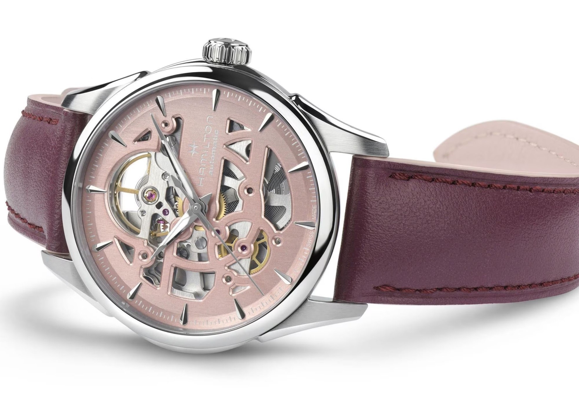 Hamilton Jazzmaster Skeleton H32265870 sind elegante Damen-Automatikuhr mit einem violetten Lederarmband und einer Dornschließe. Das Edelstahlgehäuse hat einen Durchmesser von 36 Millimetern und einen transparenten Gehäuseboden. Das rosafarbene Skelettzifferblatt wird durch ein robustes saphirglas mit Antireflexbeschichtung geschützt. Die Zeiger sind mit einer lumineszierenden Beschichtung Super-LumiNova® versehen, die eine perfekte Ablesbarkeit bei schlechten Lichtverhältnissen garantiert. Das Uhrwerk wird durch ein mechanisches Kaliber H-10-S mit automatischem Aufzug und einer Gangreserve von 80 Stunden angetrieben. Mit einer Wasserdichtigkeit von 5 ATM ist die Uhr regen- und duschfest.