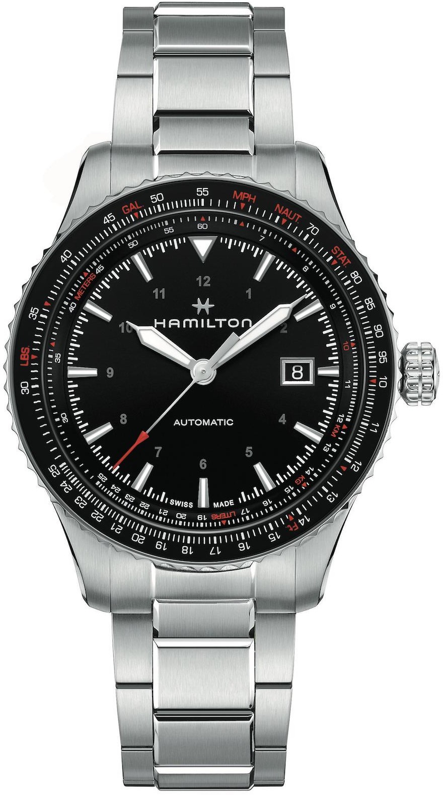 Hamilton Khaki Aviation Converter Auto H76615130 sind Herren-Automatik-Pilotenuhren mit einem Edelstahlarmband und einer Faltschließe. Das Gehäuse aus Edelstahl hat einen Durchmesser von 42 Millimetern, eine verschraubte Krone, einen transparenten Gehäuseboden und eine drehbare Lünette, mit der Piloten kritische Berechnungen und Umrechnungen während des Fluges durchführen können. Das schwarze Zifferblatt mit Datumsanzeige auf der Drei-Uhr-Position wird durch ein widerstandsfähiges saphirglas mit Antireflexbeschichtung geschützt. Aufgetragene Indizes und Zeiger haben einen  luminiszierenden Anstrich, der nach Beleuchtung die Lesbarkeit bei schlechten Lichtverhältnissen erleichtert. Der Antrieb der Uhr erfolgt durch das mechanische Uhrwerk H-10 mit automatischem Aufzug und einer Gangreserve von 80 Stunden. Mit einer Wasserdichtigkeit von 10 ATM sind die Uhren zum Schwimmen und Schnorcheln geeignet.