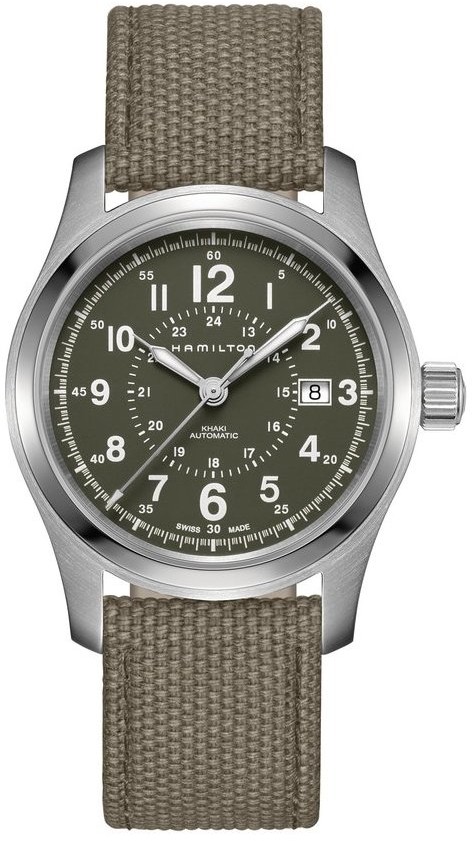 Hamilton Khaki Field Auto H70605963 sind Herren-Automatikuhr mit einem grünen Textilarmband und Dornschließe. Das Edelstahlgehäuse hat einen Durchmesser von 42 Millimetern und einen transparenten Gehäuseboden. Das grüne Zifferblatt mit Datumsanzeige und 24-Stunden-Anzeige ist durch ein robustes Saphirglas geschützt. Die Zeiger und Indizes haben eine  leuchtende Beschichtung, die nach Beleuchtung die Lesbarkeit bei schlechten Lichtverhältnissen erleichtert. Der Antrieb der Uhr wird durch das mechanische Uhrwerk H-10 mit automatischem Aufzug und einer Gangreserve von 80 Stunden gewährleistet. Mit einer Wasserdichtigkeit von 10 ATM ist die Uhr zum Schwimmen und Schnorcheln geeignet.