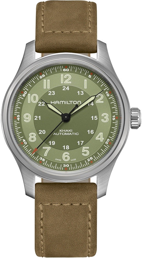 Hamilton Khaki Field Titanium Auto H70545560 sind elegante automatische Herrenuhren mit einem braunen Lederarmband mit kontrastierenden Nähten und einer Dornschließe. Das Titangehäuse hat einen Durchmesser von 42 Millimetern und einen transparenten Gehäuseboden. Das grüne Zifferblatt mit 24-Stunden-Zeitanzeige wird durch ein robustes Saphirglas geschützt. Die Zeiger und Indizes sind mit einer Leuchtbeschichtung versehen, die nach dem Aufladen die Ablesbarkeit bei schlechten Lichtverhältnissen erleichtert. Das Uhrwerk wird durch ein mechanisches H-10 Uhrwerk mit automatischem Aufzug und einer Gangreserve von 80 Stunden angetrieben. Mit einer Wasserdichtigkeit von 10 ATM sind die Uhren zum Schwimmen und Schnorcheln geeignet.