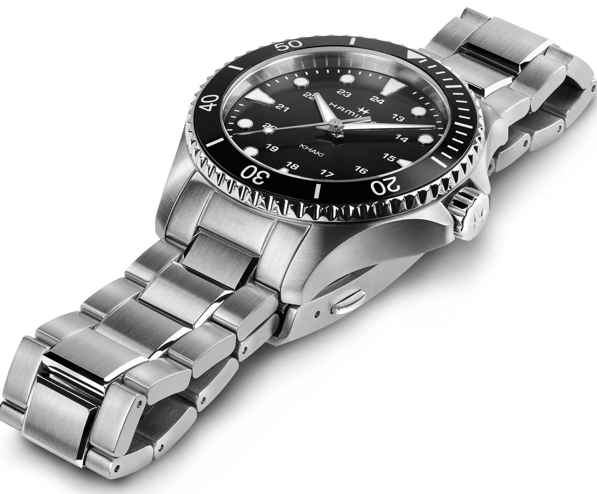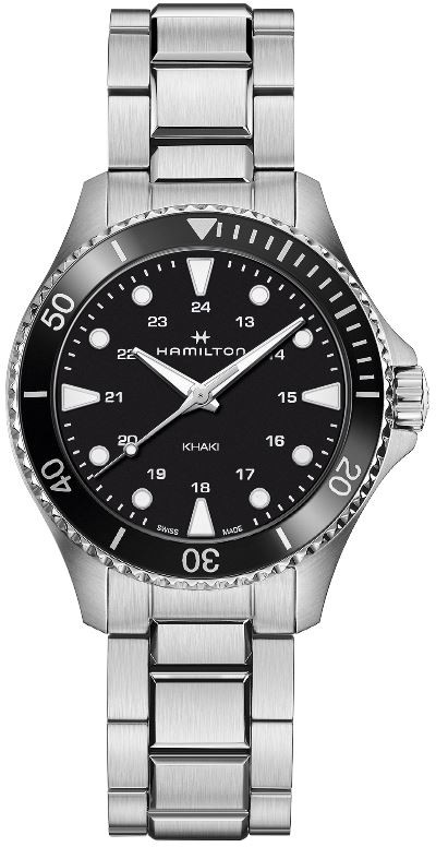 Hamilton Khaki Navy Scuba Quartz H82201131 sind batteriebetriebene Unisex-Uhren mit einem Stahlarmband und einer Klappschließe. Das Edelstahlgehäuse hat einen Durchmesser von 37 Millimetern, eine verschraubte Krone und eine einseitig drehbare Lünette. Das schwarze Zifferblatt wird durch ein widerstandsfähiges Saphirglas mit Antireflexbeschichtung geschützt. Die Zeiger und Indizes sind mit einer lumineszierenden Beschichtung Super-LumiNova® versehen, die perfekte Ablesbarkeit bei schlechten Lichtverhältnissen garantiert. Das Uhrwerk wird von einem Quarzwerk F06.105 mit Batteriestandsanzeige angetrieben. Mit einer Wasserdichtigkeit von 10 ATM sind die Uhren zum Schwimmen und Schnorcheln geeignet.