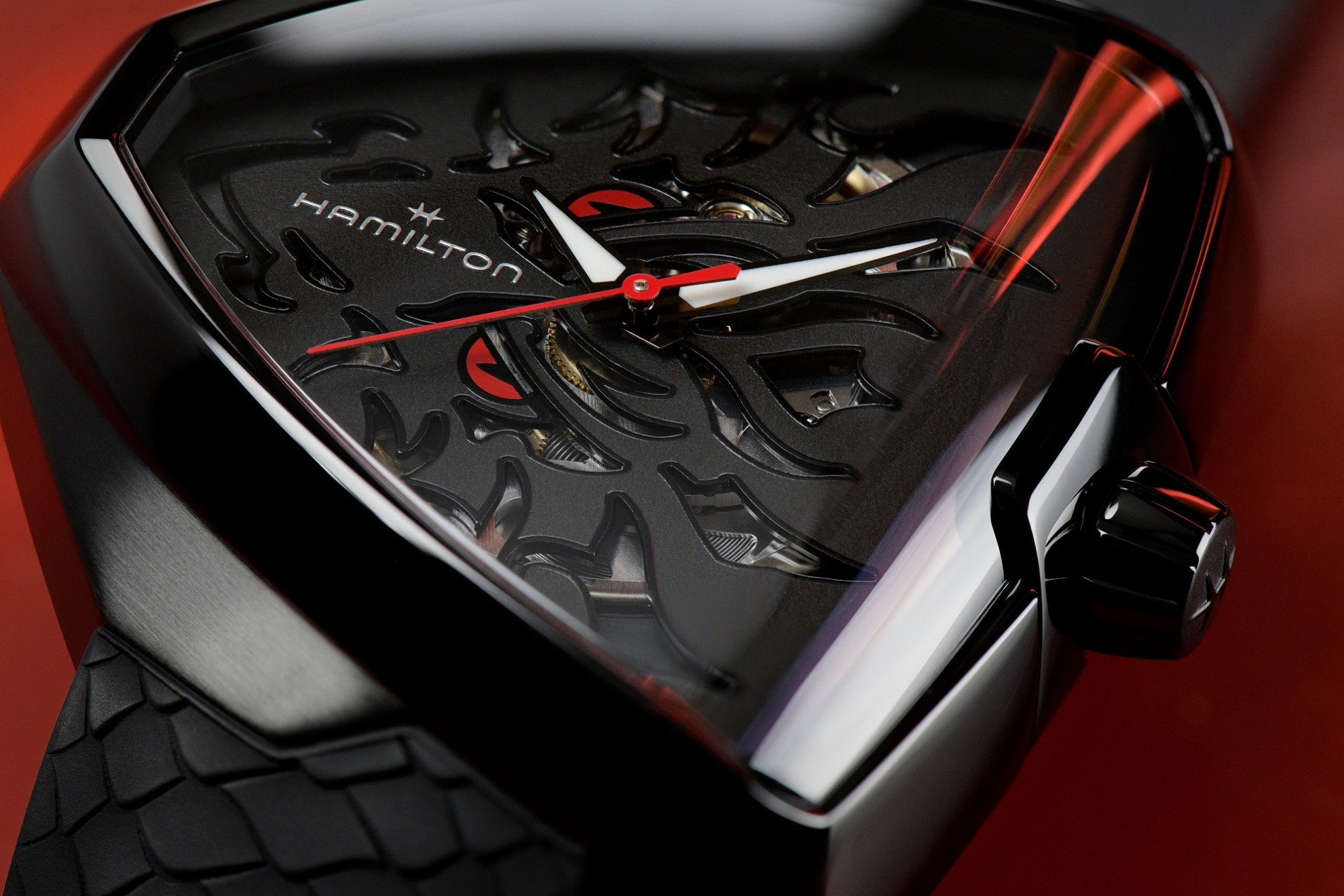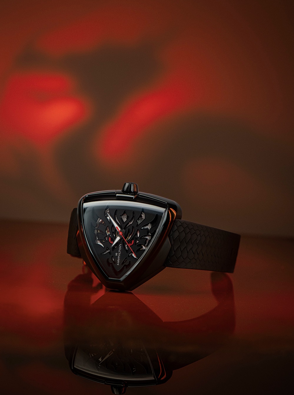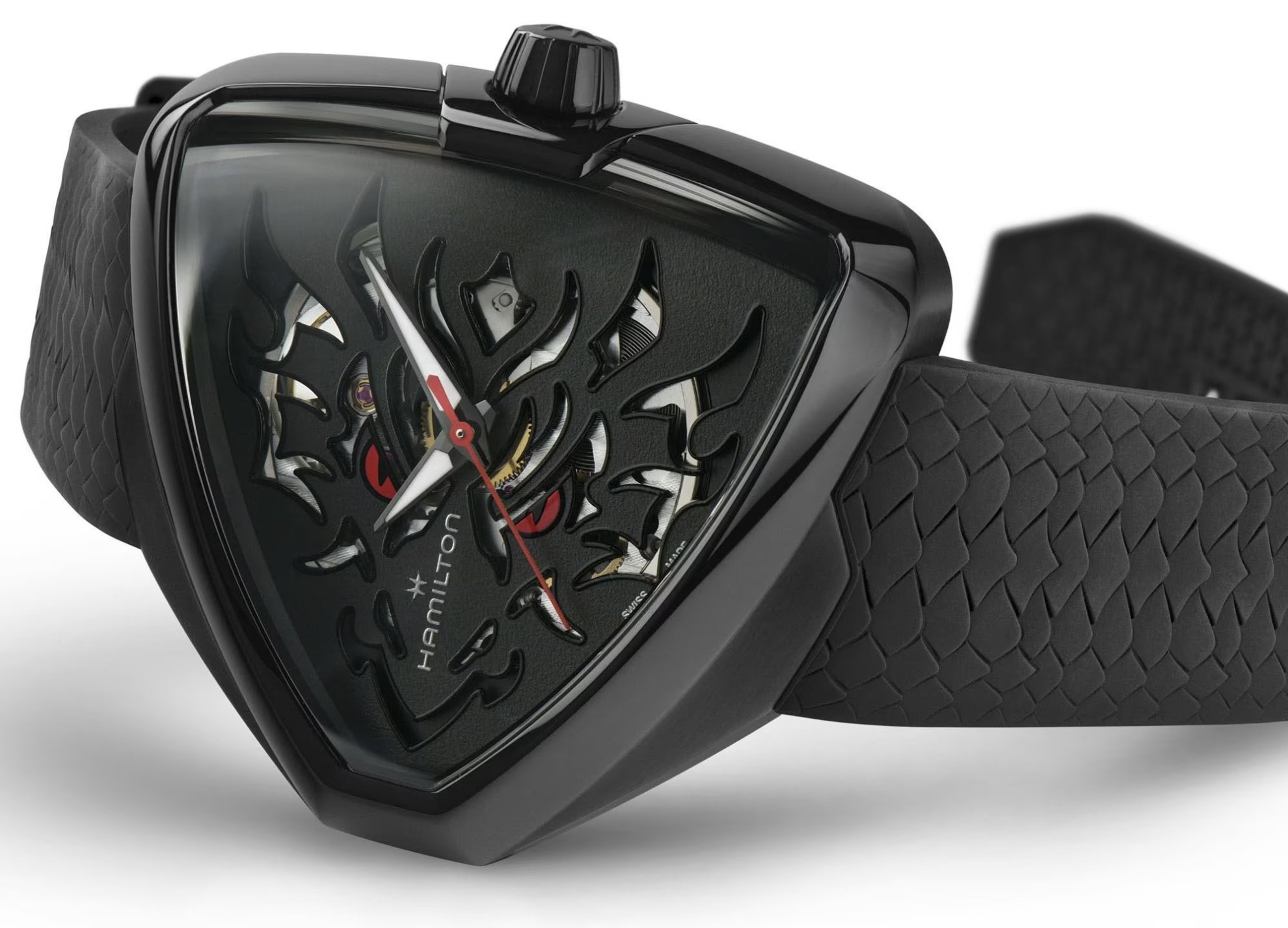 Hamilton Ventura Elvis80 Skeleton Auto H24535332 sind Herren-Sportautomatikuhren mit einem schwarzen Kautschukarmband mit Drachenhautmuster und einer Dornschließe. Das ikonische dreieckige Gehäuse aus Edelstahl mit einer schwarzen PVD-Beschichtung hat eine Größe von 42 x 45 Millimetern und einen transparenten Gehäuseboden. Das schwarze Skelett-Zifferblatt mit Öffnungen, die einen Drachenkopf bilden, ist durch ein widerstandsfähiges Saphirglas mit Antireflexbeschichtung geschützt. Die Zeiger sind mit einer Super-LumiNova®-Leuchtbeschichtung versehen, die eine perfekte Lesbarkeit bei schlechten Lichtverhältnissen garantiert. Das Uhrwerk wird durch ein mechanisches Kaliber H-10-S mit automatischem Aufzug und einer Gangreserve von 80 Stunden angetrieben. Mit einer Wasserdichtigkeit von 5 ATM sind die Uhren regen- und duschfest. Die Uhren wurden zu Ehren des ultimativen Regelbrechers und größten Fans der Ventura-Kollektion, Elvis Presley, kreiert.