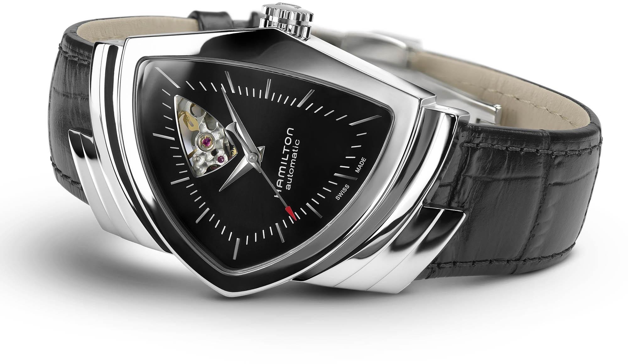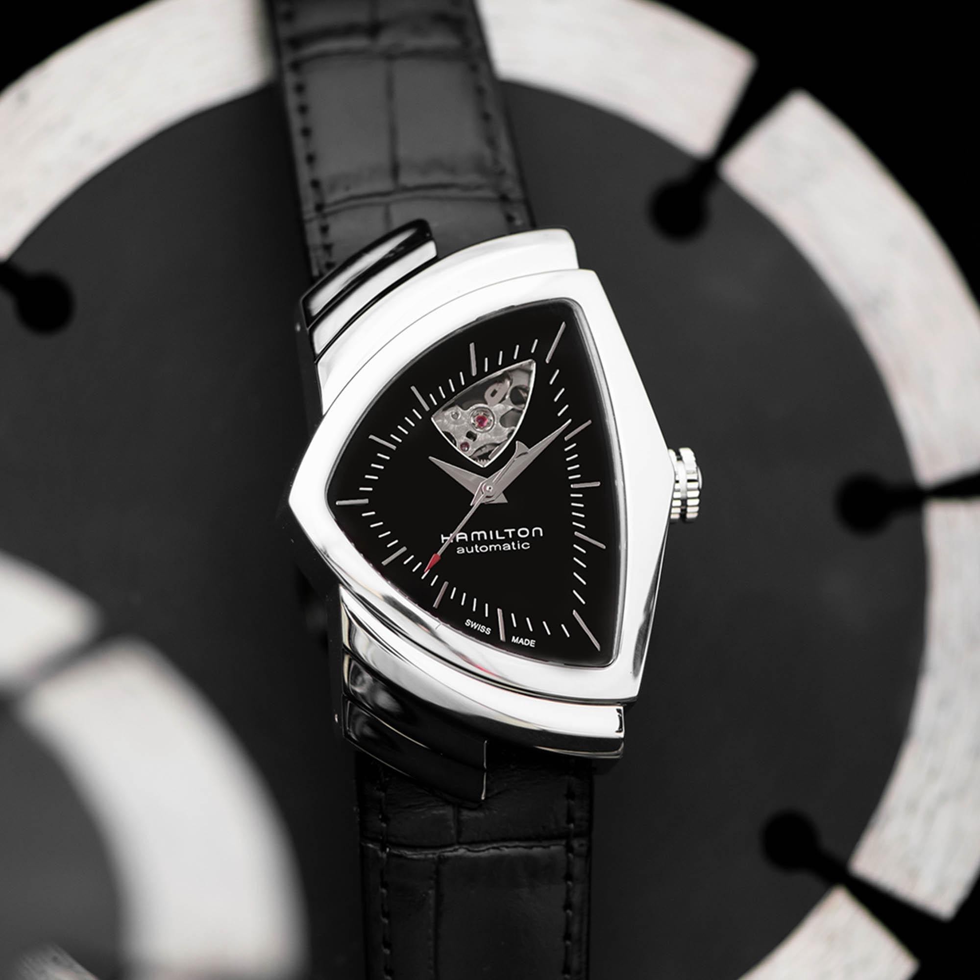 Die ikonische Gehäuseform in Form eines Dreiecks ist seit über 60 Jahren in der Hamilton-Kollektion und kann einfach nicht übersehen oder verwechselt werden. Die futuristische Form wurde 1957 durch eine andere Neuheit in Form des ersten elektrisch betriebenen Uhrwerks verstärkt und das Modell Ventura wurde zu Recht auch bei berühmten Persönlichkeiten wie Elvis Presley oder Will Smith im Film Men In Black beliebt. Derzeit sind Modelle mit Quarz- und mechanischem Uhrwerk sowohl in kleineren Damenausführungen als auch in größeren Herrengrößen erhältlich, wobei zwischen skelettierten Versionen und limitierten Auflagen gewählt werden kann. Das Gehäuse in Form eines Dreiecks ist zudem sehr bequem, da es genau das Handgelenk seines Trägers nachbildet und gleichzeitig genügend Platz für eine hervorragende Ablesbarkeit des Zifferblatts bietet. Über den Raum zur Ausdruck des Stils seines Trägers muss hier überhaupt nicht gesprochen werden, das ist völlig klar.