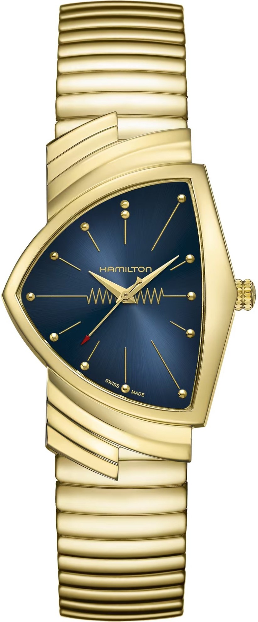Die ikonische Gehäuseform in Form eines Dreiecks ist seit über 60 Jahren in der Hamilton-Kollektion und kann einfach nicht übersehen oder verwechselt werden. Die futuristische Form wurde 1957 durch eine andere Neuheit in Form des ersten elektrisch betriebenen Uhrwerks verstärkt und das Modell Ventura wurde zu Recht auch bei berühmten Persönlichkeiten wie Elvis Presley oder Will Smith im Film Men In Black beliebt. Derzeit sind Modelle mit Quarz- und mechanischem Uhrwerk sowohl in kleineren Damenausführungen als auch in größeren Herrengrößen erhältlich, wobei zwischen skelettierten Versionen und limitierten Auflagen gewählt werden kann. Das Gehäuse in Form eines Dreiecks ist zudem sehr bequem, da es genau das Handgelenk seines Trägers nachbildet und gleichzeitig genügend Platz für eine hervorragende Ablesbarkeit des Zifferblatts bietet. Über den Raum zur Ausdruck des Stils seines Trägers muss hier überhaupt nicht gesprochen werden, das ist völlig klar.