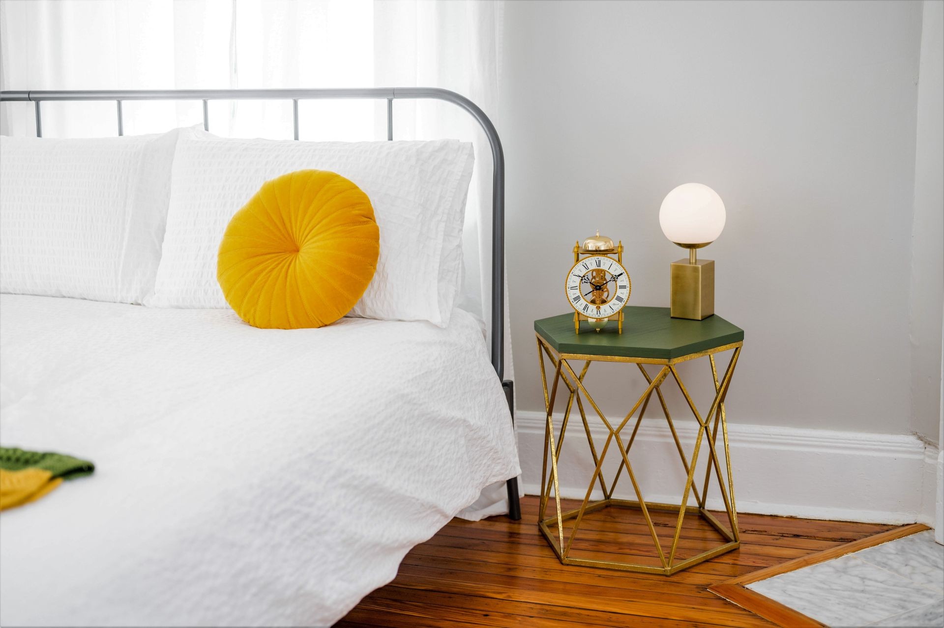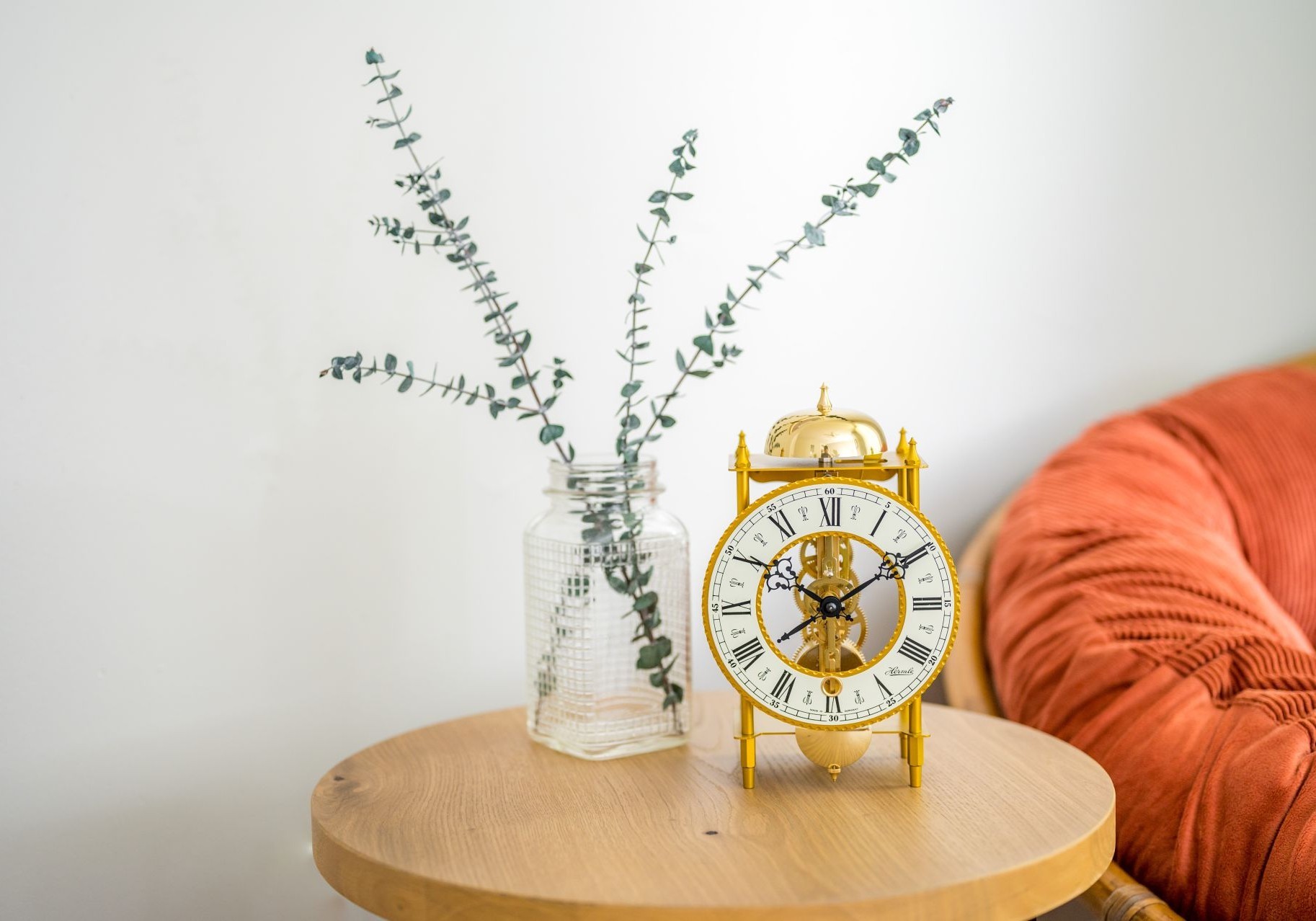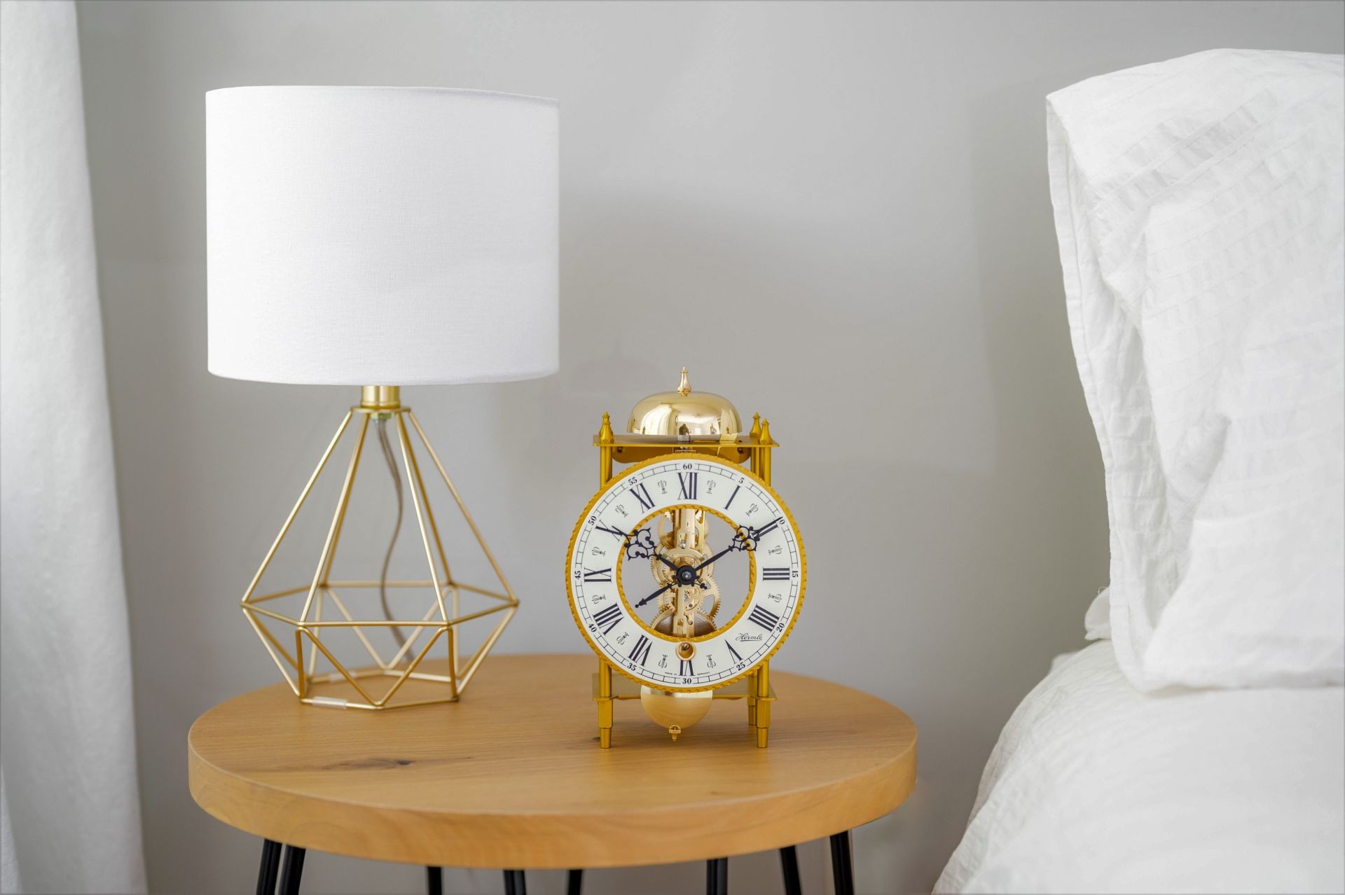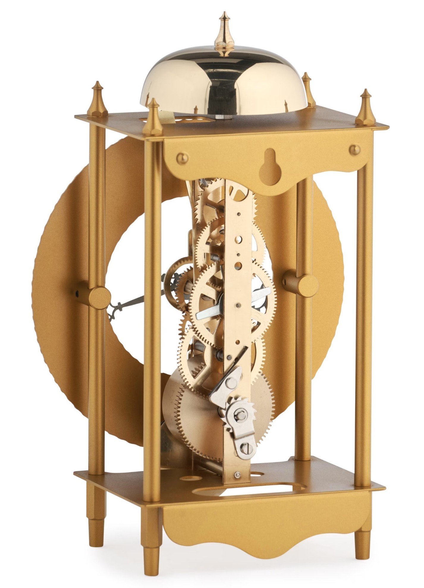 Retro-Tischuhr, die die ideale Kombination aus klassischer und moderner deutscher Präzisionsuhrmacherkunst seit 1922 symbolisiert, schlägt jede volle Stunde einmal von der Innenseite der Glocke. Das mechanische Skelett-Uhrwerk verfügt über eine achttägige Gangreserve. Das Zifferblatt ist mit markanten schwarzen römischen Ziffern verziert.