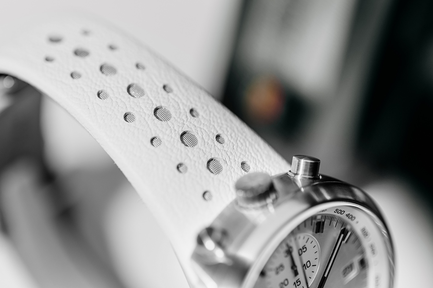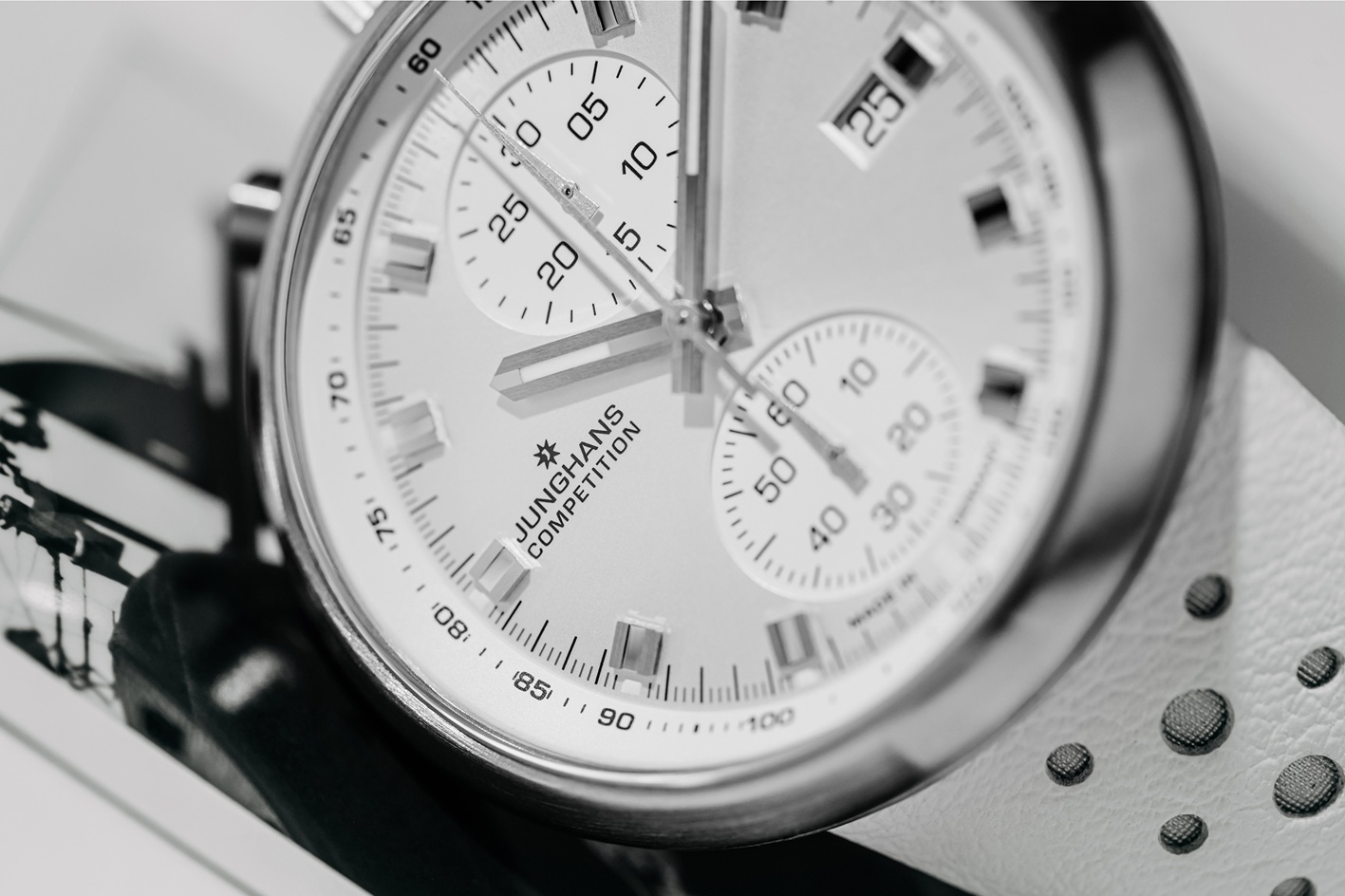 Junghans 1972 Competition 27/4509.00 sind sportliche automatische Unisex-Uhren mit einem weißen perforierten Lederarmband und Faltschließe. Das Edelstahlgehäuse hat einen Durchmesser von 45,5 Millimetern. Das silberne Zifferblatt mit Sonnenschliff, Stoppuhr, innerer Lünette mit Tachymeterskala und Datumsanzeige auf der Drei-Uhr-Position ist durch saphirbeschichtetes Glas mit Antireflexionsschicht geschützt. Die Zeiger und Indizes sind mit einer lumineszierenden Beschichtung Super-LumiNova® versehen, die nach dem Aufladen eine perfekte Lesbarkeit bei schlechten Lichtverhältnissen garantiert. Das Uhrwerk wird durch ein mechanisches Werk J880.5 mit automatischem Aufzug und einer Gangreserve von etwa 48 Stunden angetrieben. Dieses Werk mit Sekundenstoppfunktion beim Herausziehen der Krone in die äußerste Position, bekannt als Hacking, kann bei Bedarf auch manuell aufgezogen werden. Mit einer Wasserdichtigkeit von 10 ATM sind die Uhren zum Schwimmen und Schnorcheln geeignet.