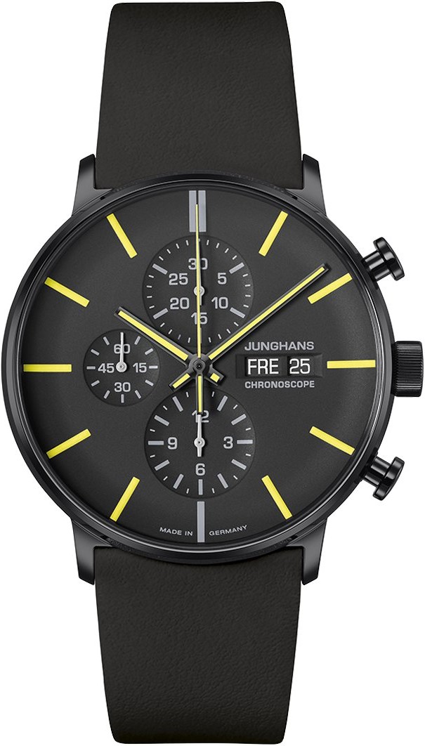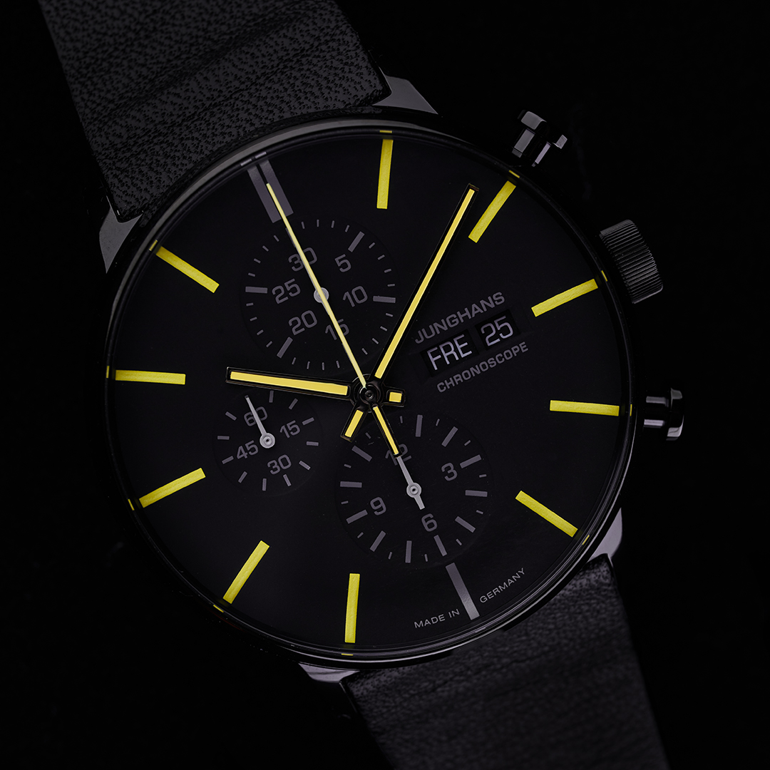 Junghans Form A Chronoscope 27/4473.02 sind Herren-Sportuhren mit Automatikwerk und einem schwarzen Lederarmband mit Dornschließe. Das Edelstahlgehäuse hat einen Durchmesser von 42 Millimetern und eine schwarze PVD-Beschichtung. Das matte schwarze Zifferblatt mit Stoppuhr, Wochentagsanzeige in Deutsch und Datumsanzeige wird durch Saphirglas mit Antireflexbeschichtung geschützt. Die Zeiger und Indizes sind mit einer lumineszierenden Beschichtung Super-LumiNova® versehen, die nach dem Aufladen eine perfekte Ablesbarkeit bei schlechten Lichtverhältnissen garantiert. Das Uhrwerk wird durch ein mechanisches Kaliber J880.1 mit automatischem Aufzug und einer Gangreserve von 56 Stunden angetrieben. Dieses Uhrwerk mit der Funktion des Sekundenstoppens beim Herausziehen der Krone in die äußerste Position, bekannt als Hacking, kann bei Bedarf auch manuell aufgezogen werden. Mit einer Wasserdichtigkeit von 5 ATM sind die Uhren gegen Regen und beim Duschen geschützt.