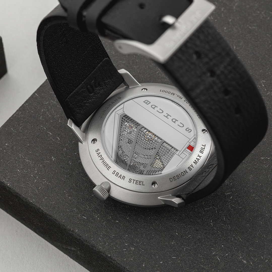 Das Farbschema der Uhr ist von der Architektur des Gebäudes in Dessau inspiriert, das auf Max Bill sofort nach seiner Ankunft einen starken Eindruck hinterließ: „Etwas bisher Ungesehenes – weiße Wände mit dunkler verglaster Fassade und kräftig roten Akzenten.“ Dieser Eindruck spiegelt sich in der Replik der Schule auf dem gläsernen Gehäuseboden der Uhr wider, der so gestaltet ist, dass Sie durch die miniaturisierte Fensterfassade die höchst präzise Bewegung des automatischen Uhrwerks beobachten können.