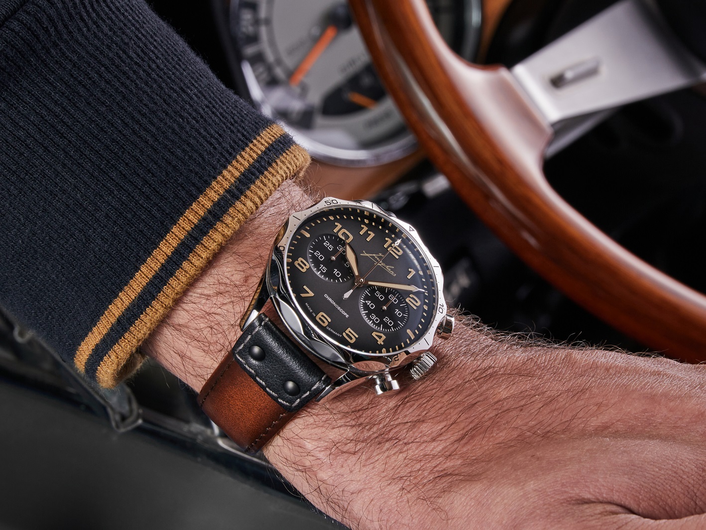 Die Marke Junghans ist seit fast 100 Jahren mit der Welt der Luftfahrt verbunden. In den 1930er Jahren stellte Junghans Instrumente für die Bedienfelder von Flugzeugen und Luftschiffen her. In den 1950er Jahren entwickelte er einen legendären Chronographen für die Piloten der deutschen Streitkräfte, der als Vorlage für die Kollektion der Pilotenuhren Meister Pilot diente. Die Faszination für die Luftfahrt ist in den Modellen der Meister Pilot Reihe deutlich zu erkennen. Auffällige Leuchtziffern und -zeiger auf dem Zifferblatt sorgen für optimale Ablesbarkeit. Die ergonomisch gestaltete drehbare Lünette sorgt für außergewöhnlichen Halt und ein einzigartiges Aussehen. Ein Lederarmband mit Nieten fehlt ebenfalls nicht.