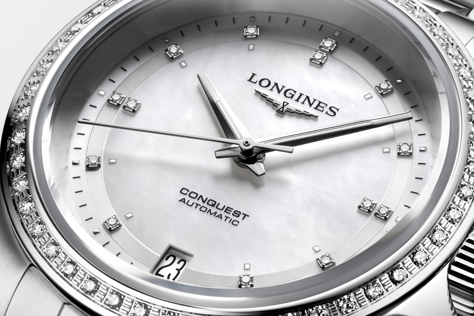 Longines Conquest L3.430.0.87.6 sind Damenuhren mit einem Stahlarmband und einer Faltschließe. Das Edelstahlgehäuse hat einen Durchmesser von 34 Millimetern, einen transparenten Gehäuseboden, eine verschraubte Krone und eine Lünette, die mit 48 Diamanten Top Wesselton mit einer Reinheit von IF-VVS und einem Gewicht von 0,403 ct besetzt ist. Das Perlmuttzifferblatt mit Datumsanzeige und 14 Diamanten Top Wesselton mit einer Reinheit von VS-SI und einem Gewicht von 0,035 ct wird durch ein Saphirglas mit beidseitiger Antireflexbeschichtung geschützt und seine Schönheit kommt besonders bei direktem Licht zur Geltung, wenn das Farbspiel des Perlmutts zu beobachten ist. Die Zeiger und Punkte entlang des Zifferblattrandes sind mit einem Leuchtmittel Super-LumiNova® beschichtet, das nach dem Aufladen perfekte Ablesbarkeit bei schlechten Lichtverhältnissen garantiert. Das Uhrwerk wird von einem mechanischen Kaliber L888 mit automatischem Aufzug und einer Gangreserve von etwa 72 Stunden angetrieben. Dieses Uhrwerk mit der Funktion des Anhaltens des Sekundenzeigers beim Herausziehen der Krone in die äußerste Position, bekannt als Hacking, kann bei Bedarf auch manuell aufgezogen werden. Das Kaliber ist mit einer Siliziumspirale ausgestattet, die der Uhr eine hohe Widerstandsfähigkeit gegen Magnetfelder verleiht. Mit einer Wasserdichtigkeit von 10 ATM sind die Uhren zum Schwimmen und Schnorcheln geeignet.