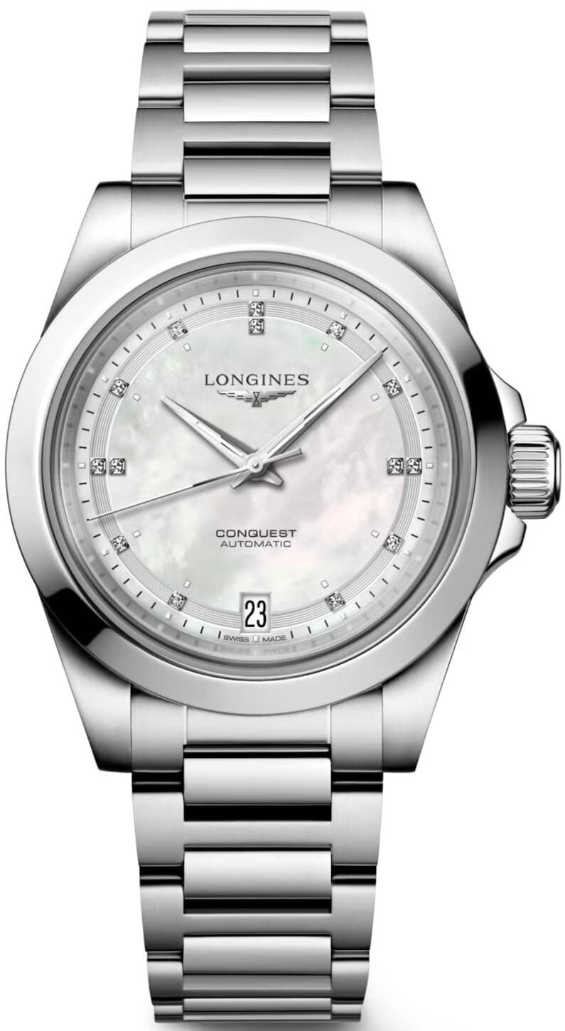 Longines Conquest L3.430.4.87.6 sind Damenuhren im klassischen Stil mit einem Edelstahlarmband und einer Faltschließe. Das Gehäuse aus Edelstahl hat einen Durchmesser von 34 Millimetern, einen transparenten Gehäuseboden und eine verschraubte Krone. Das Perlmuttzifferblatt mit Datumsanzeige und 14 Diamanten Top Wesselton mit Reinheit VS-SI und einem Gewicht von 0,035 ct ist durch ein Saphirglas mit beidseitiger Antireflexbeschichtung geschützt und seine Schönheit kommt besonders unter direktem Licht zur Geltung, wenn wir das Farbenspiel der Perlmutt beobachten können. Die Zeiger zusammen mit den Punkten am Umfang des Zifferblatts sind mit einer lumineszierenden Beschichtung Super-LumiNova® versehen, die nach dem Aufladen eine perfekte Ablesbarkeit bei schlechten Lichtverhältnissen garantiert. Das Uhrwerk wird von einem mechanischen Kaliber L888 mit automatischem Aufzug und einer Gangreserve von etwa 72 Stunden angetrieben. Dieses Uhrwerk mit der Funktion des Sekundenstoppes beim Herausziehen der Krone in die Endposition, bekannt als Hacking, kann bei Bedarf auch manuell aufgezogen werden. Das Kaliber ist mit einer Siliziumspirale ausgestattet, die der Uhr eine hohe Resistenz gegen Magnetfelder verleiht. Mit einer Wasserdichtigkeit von 10 ATM sind die Uhren für Schwimmen und Schnorcheln geeignet.