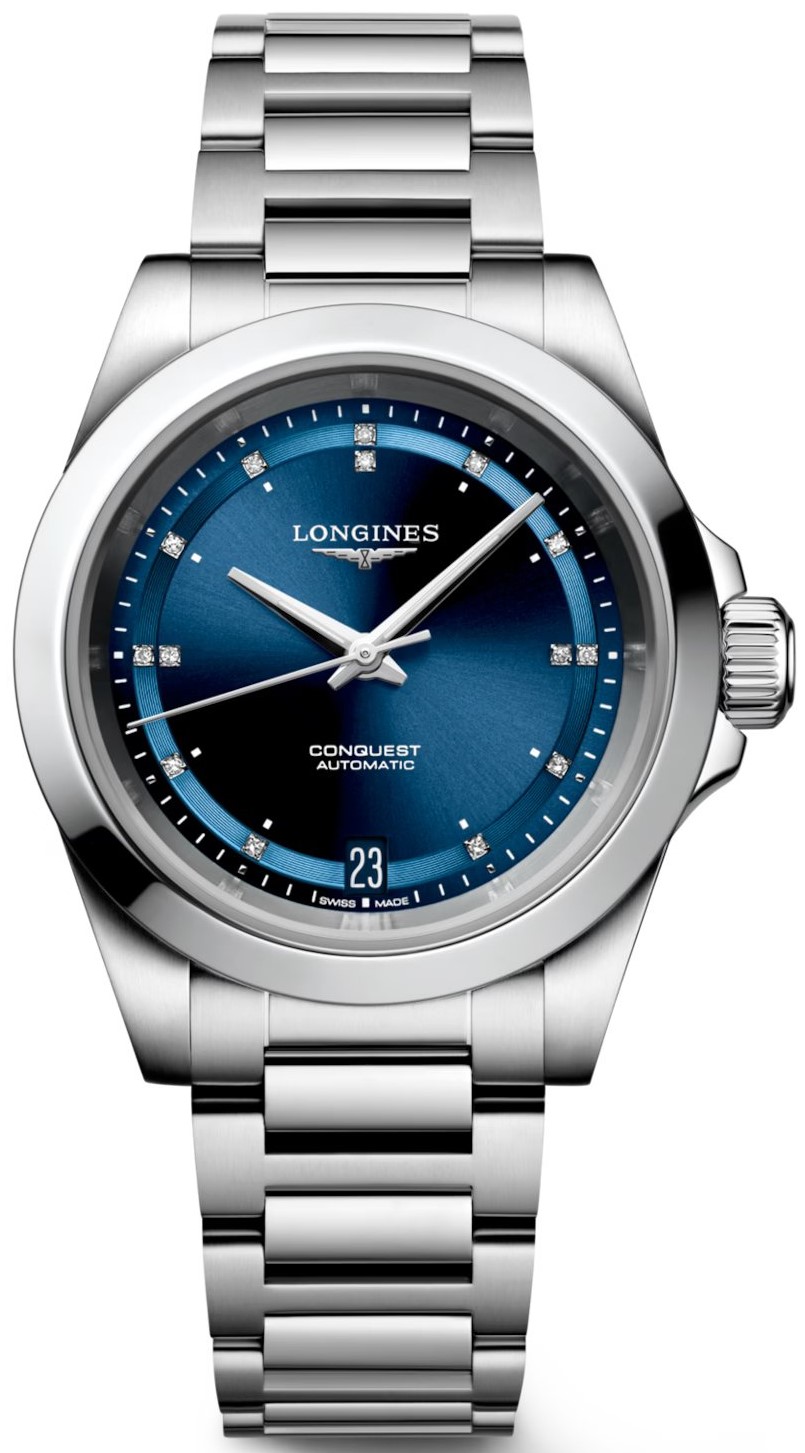 Longines Conquest L3.430.4.97.6 sind Damen-Uhren im klassischen Stil an einem Stahlarmband mit Schmetterlingsschließe. Das Edelstahlgehäuse hat einen Durchmesser von 34 Millimetern, einen transparenten Gehäuseboden und eine verschraubte Krone. Das blaue Zifferblatt mit Sonnenschliff-Effekt, Datumsanzeige und 14 Diamanten Top Wesselton mit Reinheit VS-SI und einem Gewicht von 0,035 ct wird durch Saphirglas mit beidseitiger Antireflexbeschichtung geschützt. Die Zeiger zusammen mit den Punkten auf dem Zifferblatt sind mit einer Leuchtbeschichtung Super-LumiNova® versehen, die nach dem Aufladen perfekte Ablesbarkeit bei schlechten Lichtverhältnissen garantiert. Das Uhrwerk wird durch ein mechanisches Kaliber L888 mit automatischem Aufzug und einer Gangreserve von etwa 72 Stunden angetrieben. Dieses Kaliber mit der Funktion des Sekundenstoppes beim Herausziehen der Krone in die äußerste Position, bekannt als Hacking, kann bei Bedarf auch manuell aufgezogen werden. Das Kaliber ist mit einer Silizium-Spiralfeder ausgestattet, die der Uhr eine hohe Resistenz gegen Magnetfelder verleiht. Mit einer Wasserdichtigkeit von 10 ATM sind die Uhren für Schwimmen und Schnorcheln geeignet.