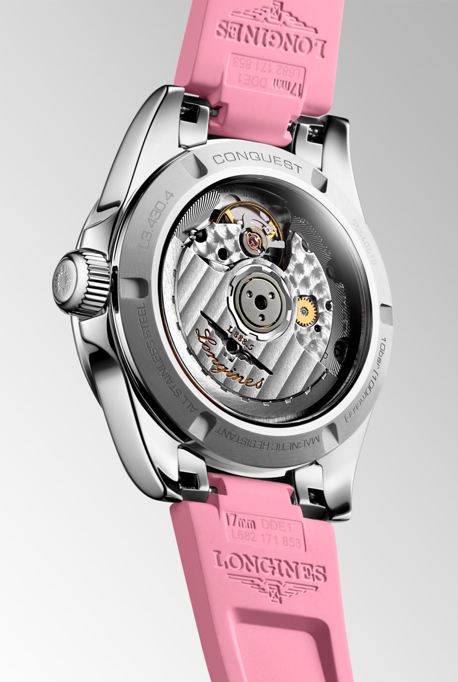 Longines Conquest L3.430.4.99.9 sind Damen-Automatikuhr mit einem rosa Kautschukarmband und einer Faltschließe. Das Edelstahlgehäuse hat einen Durchmesser von 34 Millimetern, einen transparenten Gehäuseboden und eine verschraubte Krone. Das rosa Zifferblatt mit Sonnenschliff und Datumsanzeige auf sechs Uhr wird durch ein Saphirglas mit beidseitiger Antireflexbeschichtung geschützt. Zeiger und Indizes sind mit einem lumineszierenden Anstrich Super-LumiNova® versehen, der nach dem Aufladen perfekte Lesbarkeit bei schlechten Lichtverhältnissen garantiert. Das Uhrwerk wird von einem mechanischen Kaliber L888 mit automatischem Aufzug und einer Gangreserve von ca. 72 Stunden angetrieben. Dieses Uhrwerk mit der Funktion des Anhaltens des Sekundenzeigers beim Herausziehen der Krone in die äußerste Position, bekannt als Hacking, kann bei Bedarf auch manuell aufgezogen werden. Das Kaliber ist mit einer Siliziumspirale ausgestattet, die der Uhr eine hohe Widerstandsfähigkeit gegen Magnetfelder verleiht. Mit einer Wasserdichtigkeit von 10 ATM ist die Uhr für Schwimmen und Schnorcheln geeignet.