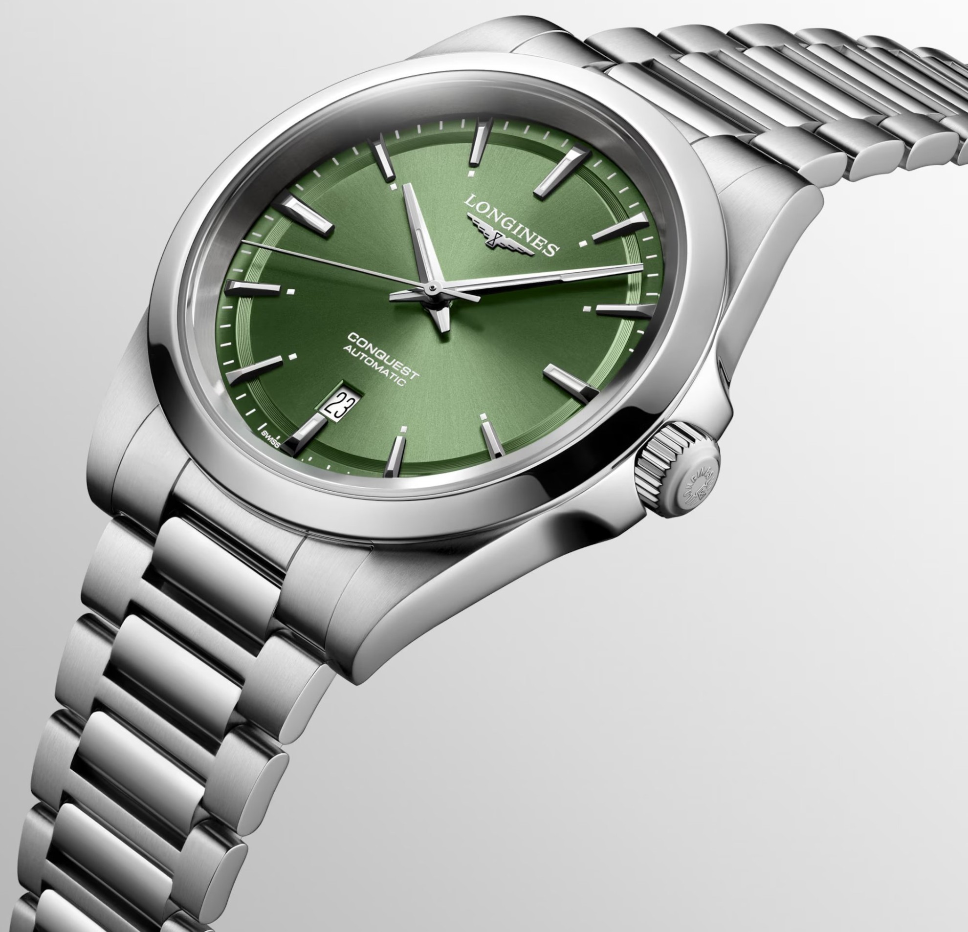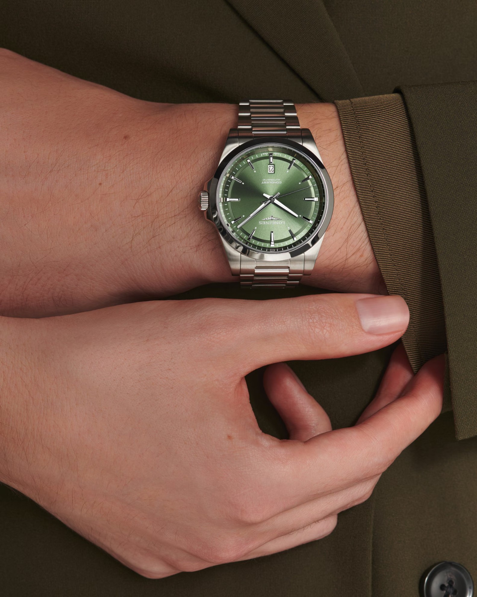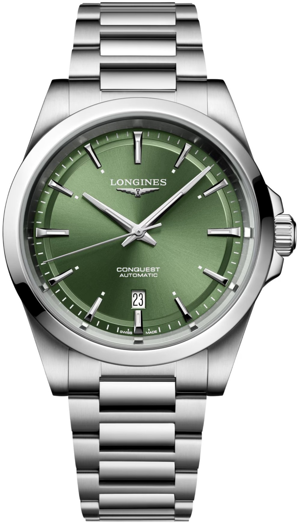Longines Conquest L3.830.4.02.6 sind klassische Herrenuhren mit einem Stahlarmband und einer Faltschließe. Das Gehäuse aus Edelstahl hat einen Durchmesser von 41 Millimetern, einen transparenten Gehäuseboden und eine verschraubte Krone. Das grüne Zifferblatt mit Sonnenschliff und Datumsanzeige bei sechs Uhr wird durch ein Saphirglas mit beidseitiger Antireflexbeschichtung geschützt. Die Zeiger und Indizes sind mit einem Leuchtanstrich Super-LumiNova® versehen, der nach Beleuchtung perfekte Lesbarkeit bei schlechten Lichtverhältnissen garantiert. Der Uhrbetrieb wird durch ein mechanisches Uhrwerk L888 mit automatischem Aufzug und einer Gangreserve von etwa 72 Stunden gewährleistet. Dieses Uhrwerk mit der Funktion des Anhaltens des Sekundenzeigers beim Herausziehen der Krone in die äußerste Position, bekannt als Hacking, kann bei Bedarf auch manuell aufgezogen werden. Das Kaliber ist mit einer Silizium-Spiralfeder ausgestattet, die den Uhren eine hohe Resistenz gegen Magnetfelder verleiht. Mit einer Wasserdichtigkeit von 10 ATM sind die Uhren zum Schwimmen und Schnorcheln geeignet.