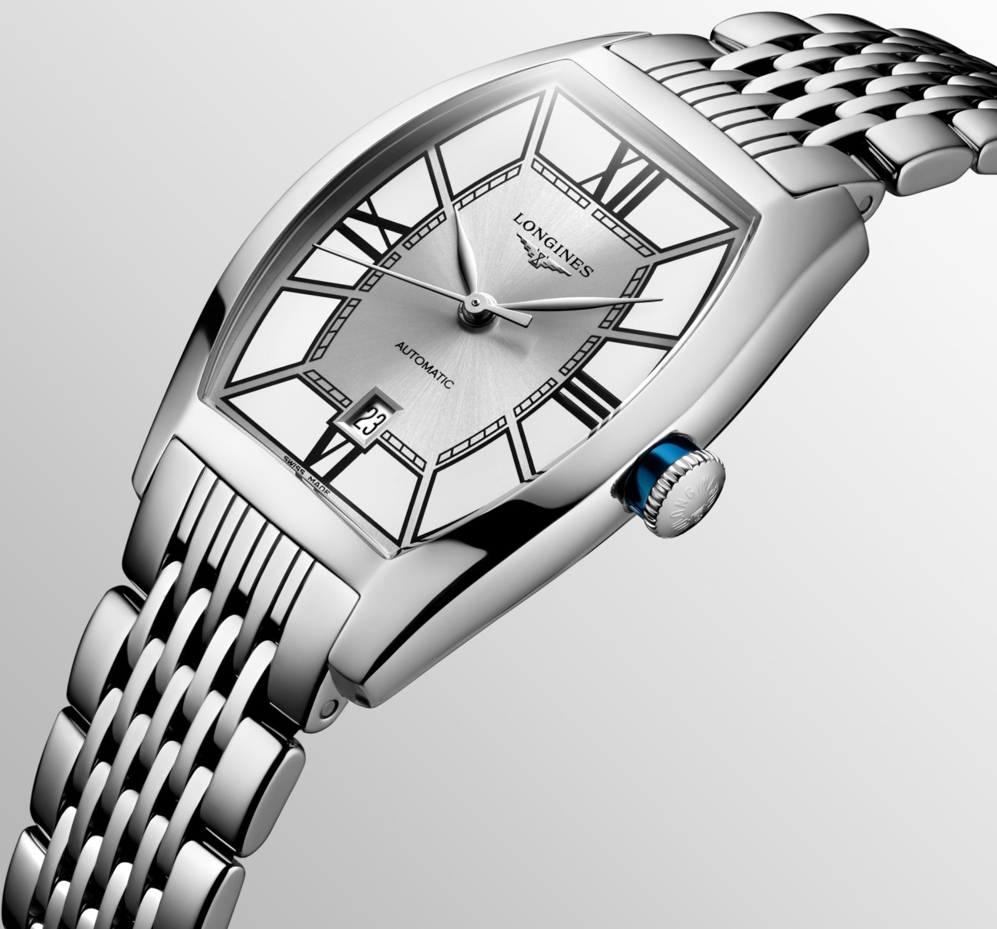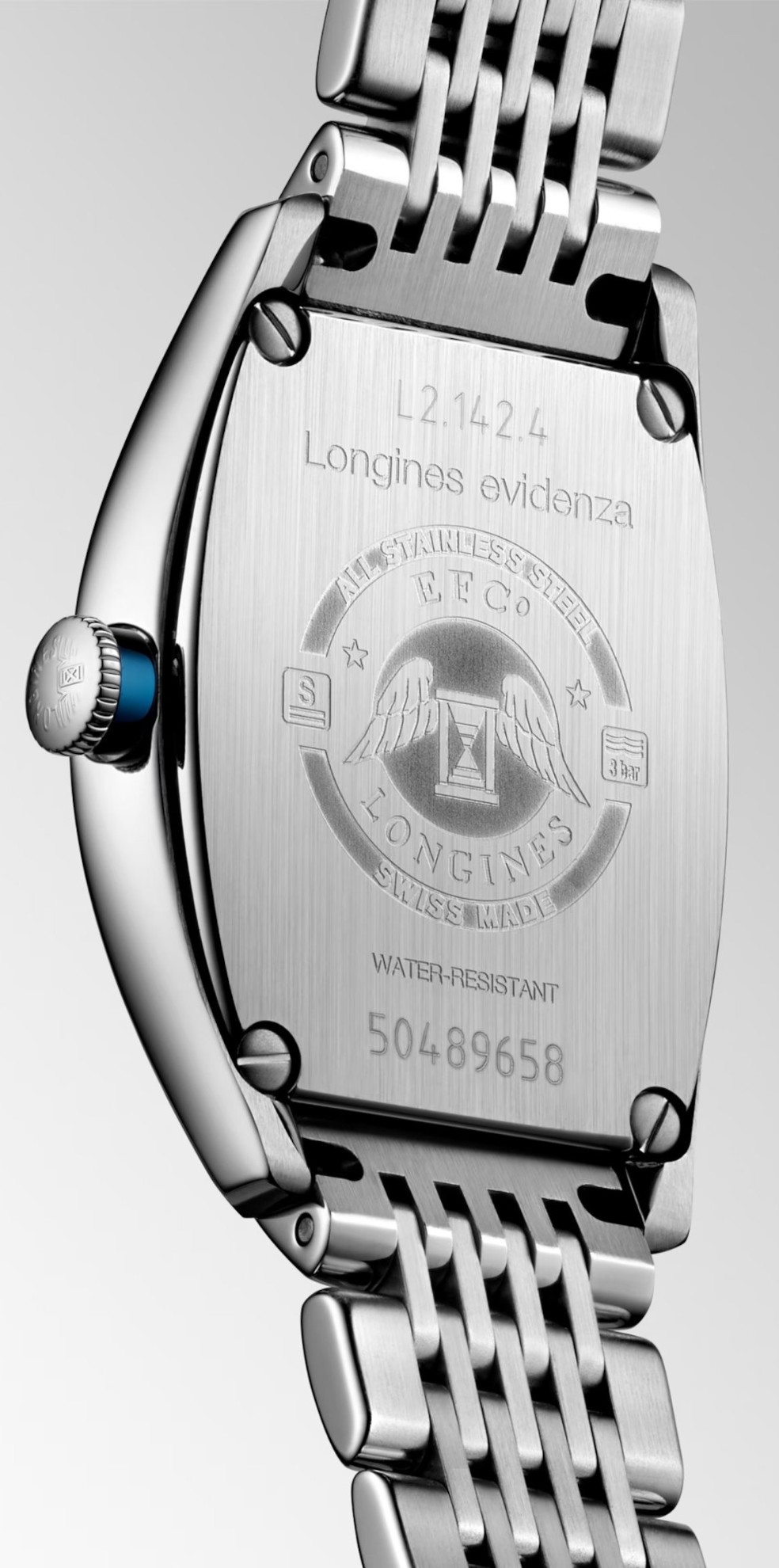 Longines Evidenza L2.142.4.76.6 sind klassische Damen-Automatikuhr mit einem Stahlarmband und Faltschließe. Das Edelstahlgehäuse hat die Größe von 26 x 30,6 Millimetern. Das eckige weiße Zifferblatt mit silbernem Zentrum und Sonnenschliff-Effekt und Datumsanzeige bei sechs Uhr wird durch ein robustes Saphirglas mit Antireflexbeschichtung geschützt. Der Antrieb der Uhr erfolgt durch ein mechanisches Uhrwerk L592 mit automatischem Aufzug und einer Gangreserve von 45 Stunden. Mit einer Wasserdichtigkeit von 3 ATM sind die Uhren regen- und handwaschfest.