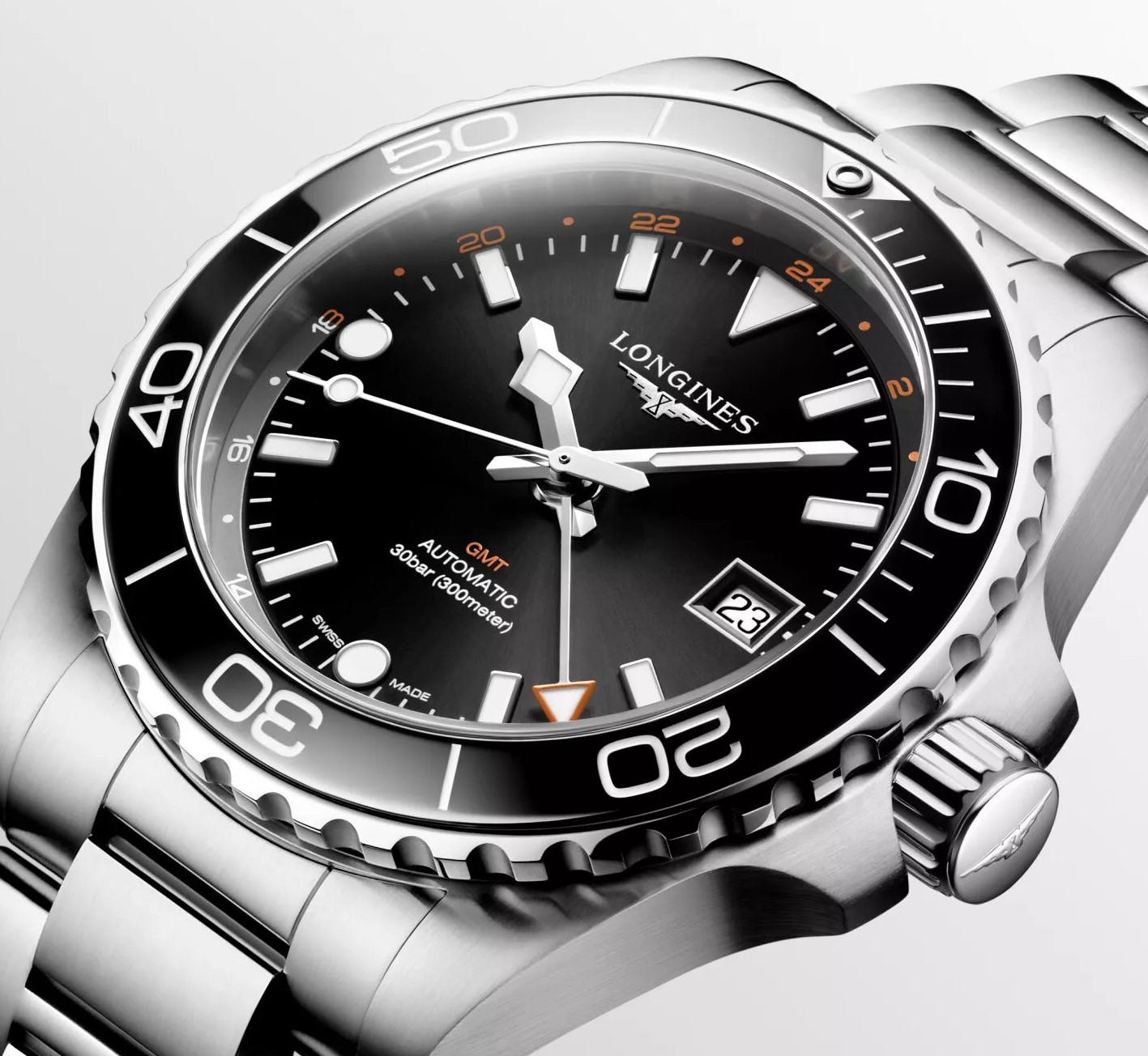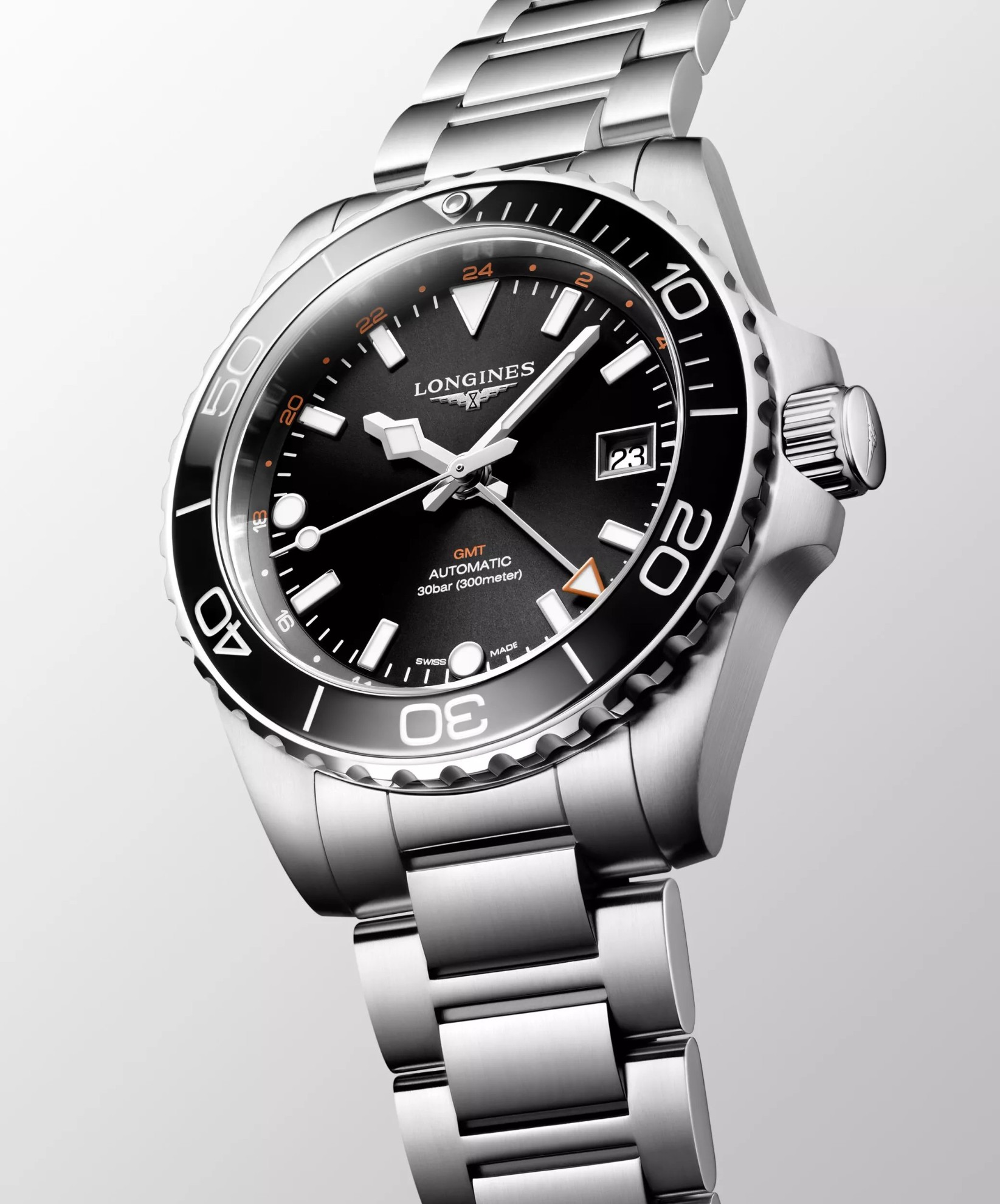 Longines Hydroconquest GMT L3.790.4.56.6 sind Herren-Taucheruhren mit automatischem Antrieb und einem Stahlarmband mit Klappschließe. Das Gehäuse aus Edelstahl hat einen Durchmesser von 41 Millimetern, eine gebürstete Oberfläche, eine verschraubte Krone und eine einseitig drehbare Lünette mit schwarzer Keramikeinlage. Das schwarze Zifferblatt mit Sonnenschliff, Datumsanzeige, GMT-Funktion und 24-Stunden-Anzeige wird durch ein Saphirglas mit beidseitiger Antireflexbeschichtung geschützt. Aufgetragene Stundenindizes, Zeiger und Punkt auf der Lünette sind mit einer Leuchtbeschichtung Super-LumiNova® versehen, die nach dem Aufladen eine perfekte Ablesbarkeit bei schlechten Lichtverhältnissen garantiert. Der Antrieb der Uhr wird durch ein mechanisches Kaliber L844 mit automatischem Aufzug und einer Gangreserve von etwa 72 Stunden gewährleistet. Das Kaliber ist gegen Magnetfelder resistent. Mit einer Wasserdichtigkeit von 30 ATM sind die Uhren für das Tieftauchen geeignet.
