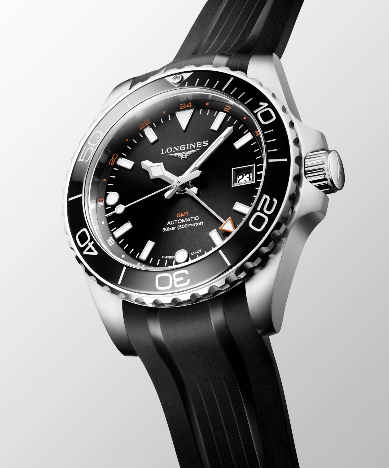 Longines Hydroconquest GMT L3.790.4.56.9 sind Herren-Taucheruhren mit Automatikwerk an einem schwarzen Kautschukarmband mit Faltschließe. Das Edelstahlgehäuse hat einen Durchmesser von 41 Millimetern, eine gebürstete Oberfläche, eine verschraubte Krone und eine einseitig drehbare Lünette mit schwarzer Keramikeinlage. Das schwarze Zifferblatt mit Sonnenschliff-Effekt, Datumsanzeige, GMT-Funktion und 24-Stunden-Anzeige wird durch Saphirglas mit beidseitiger Antireflexbeschichtung geschützt. Aufgetragene Stundenindizes, Zeiger und Punkt auf der Lünette sind mit einer Leuchtbeschichtung Super-LumiNova® versehen, die nach dem Aufladen perfekte Ablesbarkeit bei schlechten Lichtverhältnissen garantiert. Das Uhrwerk wird durch ein mechanisches Kaliber L844 mit automatischem Aufzug und einer Gangreserve von etwa 72 Stunden angetrieben. Das Kaliber ist gegen Magnetfelder resistent. Mit einer Wasserdichtigkeit von 30 ATM sind die Uhren für das Tauchen in großer Tiefe geeignet.