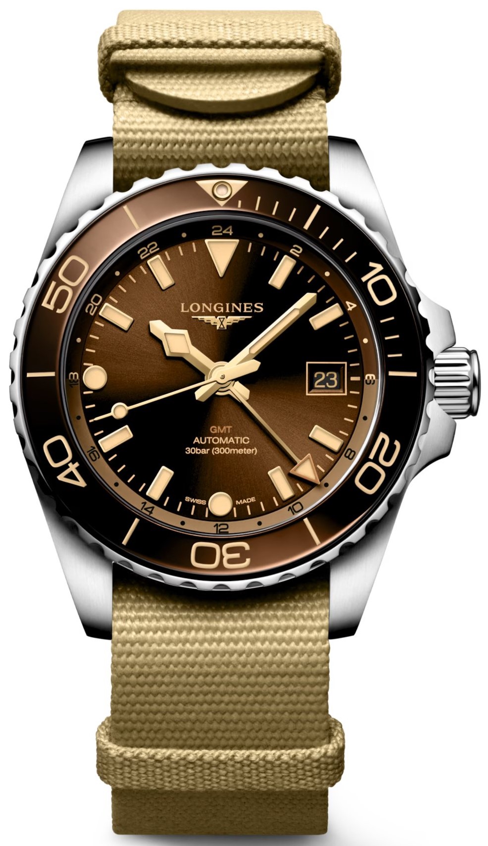 Longines Hydroconquest GMT L3.790.4.66.2 sind Herren-Taucheruhren mit Automatikwerk an einem beigen Textil-NATO-Armband mit Dornschließe. Das Gehäuse aus Edelstahl hat einen Durchmesser von 41 Millimetern, eine gebürstete Oberfläche, eine verschraubte Krone und eine einseitig drehbare Lünette mit brauner Keramikeinlage. Das braune Zifferblatt mit Sonnenschliff, Datumsanzeige, GMT-Funktion und 24-Stunden-Anzeige wird durch Saphirglas mit beidseitiger Antireflexbeschichtung geschützt. Aufgetragene Stundenindizes, Zeiger und Punkt auf der Lünette sind mit einer lumineszierenden Beschichtung Super-LumiNova® versehen, die nach dem Aufladen perfekte Ablesbarkeit bei schlechten Lichtverhältnissen garantiert. Der Antrieb der Uhr erfolgt durch das mechanische Uhrwerk L844 mit automatischem Aufzug und einer Gangreserve von etwa 72 Stunden. Das Kaliber ist gegen Magnetfelder resistent. Mit einer Wasserdichtigkeit von 30 ATM ist die Uhr für das Tieftauchen geeignet.