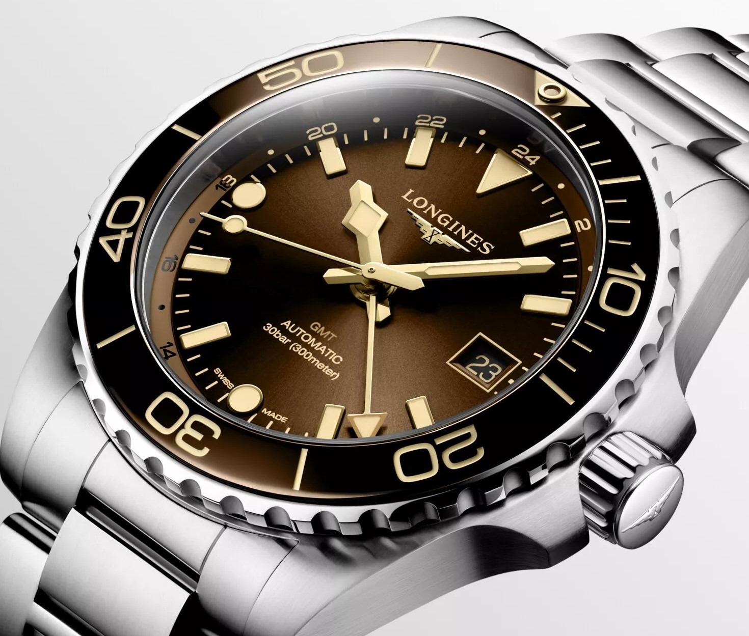 Longines Hydroconquest GMT L3.790.4.66.6 sind Herren-Taucheruhren mit automatischem Antrieb und einem Stahlarmband mit Klappschließe. Das Gehäuse aus Edelstahl hat einen Durchmesser von 41 Millimetern, eine gebürstete Oberfläche, eine verschraubte Krone und eine einseitig drehbare Lünette mit brauner Keramikeinlage. Das braune Zifferblatt mit Sonnenschliff, Datumsanzeige, GMT-Funktion und 24-Stunden-Anzeige wird durch ein Saphirglas mit beidseitiger Antireflexbeschichtung geschützt. Aufgetragene Stundenindizes, Zeiger und Punkt auf der Lünette sind mit einer Leuchtbeschichtung Super-LumiNova® versehen, die nach dem Aufladen eine perfekte Ablesbarkeit bei schlechten Lichtverhältnissen garantiert. Der Antrieb der Uhr wird durch ein mechanisches Kaliber L844 mit automatischem Aufzug und einer Gangreserve von etwa 72 Stunden gewährleistet. Das Kaliber ist gegen Magnetfelder resistent. Mit einer Wasserdichtigkeit von 30 ATM sind die Uhren für das Tieftauchen geeignet.