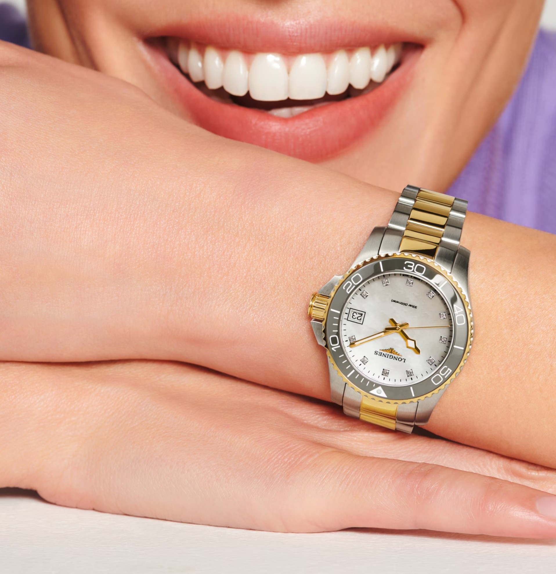 Longines HydroConquest L3.370.3.87.6 sind Damen-Taucheruhren mit Quarzwerk und einem bicolor Edelstahlarmband mit Faltschließe. Das Gehäuse aus Edelstahl hat einen Durchmesser von 32 Millimetern, eine gebürstete Oberfläche, eine verschraubte Krone und eine einseitig drehbare Lünette mit grauer Keramikeinlage. Die mittleren Glieder des Armbands, die Lünette und die Krone sind mit einer goldfarbenen PVD-Beschichtung versehen. Das Perlmuttzifferblatt mit Datumsanzeige auf der Drei-Uhr-Position wird durch ein Saphirglas mit beidseitiger Antireflexbeschichtung geschützt und seine Schönheit kommt besonders bei direktem Licht zur Geltung, wenn man das Farbspiel des Perlmutts beobachten kann. Das Zifferblatt ist mit 11 Diamanten Top Wesselton von Reinheit VS-SI und einem Gewicht von 0,044 ct verziert. Die Zeiger und der Punkt auf der Lünette sind mit einer Leuchtbeschichtung Super-LumiNova® versehen, die nach Beleuchtung eine perfekte Ablesbarkeit bei schlechten Lichtverhältnissen garantiert. Der Antrieb der Uhr erfolgt durch ein Quarzwerk L156 mit einer Laufzeit von bis zu 25 Monaten und einer Anzeige für schwache Batterie. Mit einer Wasserdichtigkeit von 30 ATM ist die Uhr für das Tiefseetauchen geeignet.