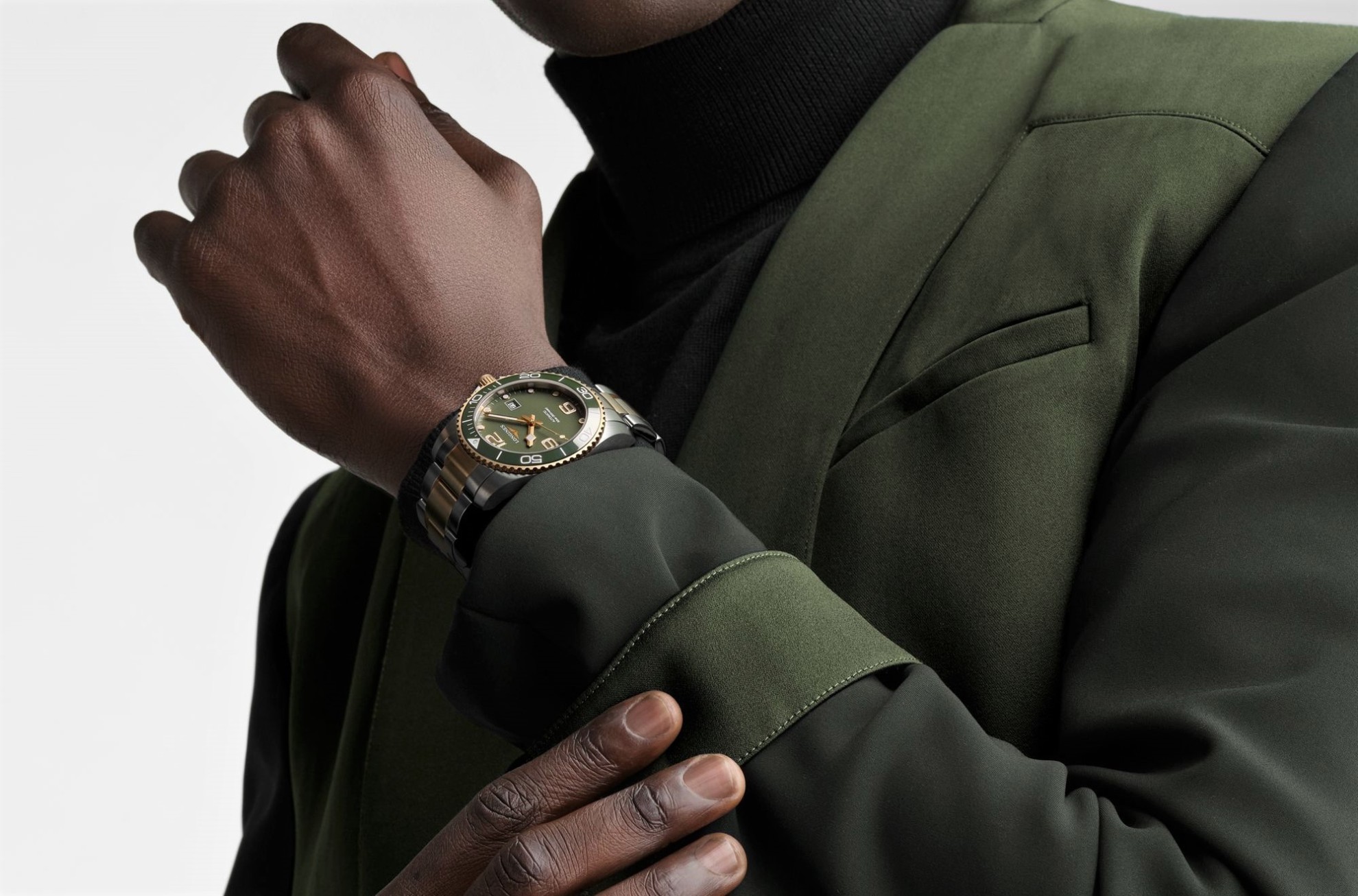 Longines HydroConquest L3.781.3.06.7 sind Herren-Taucheruhren mit Automatikwerk an einem Edelstahl-Bicolor-Armband mit Faltschließe. Das Gehäuse aus Edelstahl hat einen Durchmesser von 41 Millimetern, eine gebürstete Oberfläche, eine verschraubte Krone und eine einseitig drehbare Lünette mit grüner Keramikeinlage. Die mittleren Glieder des Armbands, die Lünette und die Krone sind mit einer goldfarbenen PVD-Beschichtung versehen. Das grüne Zifferblatt mit Datumsanzeige auf der Drei-Uhr-Position wird durch Saphirglas mit beidseitiger Antireflexbeschichtung geschützt. Aufgetragene Stundenindizes, Zeiger und der Punkt auf der Lünette sind mit einem Leuchtanstrich Super-LumiNova® versehen, der nach dem Aufladen eine perfekte Ablesbarkeit bei schlechten Lichtverhältnissen garantiert. Der Uhrgang wird durch ein mechanisches Kaliber L888 mit automatischem Aufzug und einer Gangreserve von etwa 72 Stunden gewährleistet. Dieses Kaliber mit der Funktion zum Anhalten des Sekundenzeigers beim Herausziehen der Krone in die äußerste Position, bekannt als Hacking, kann bei Bedarf auch manuell aufgezogen werden. Das Kaliber ist mit einer Silizium-Spiralfeder ausgestattet, die der Uhr eine hohe Resistenz gegen Magnetfelder verleiht. Die Uhr mit einer Wasserdichtigkeit von 30 ATM ist für das Tieftauchen geeignet.