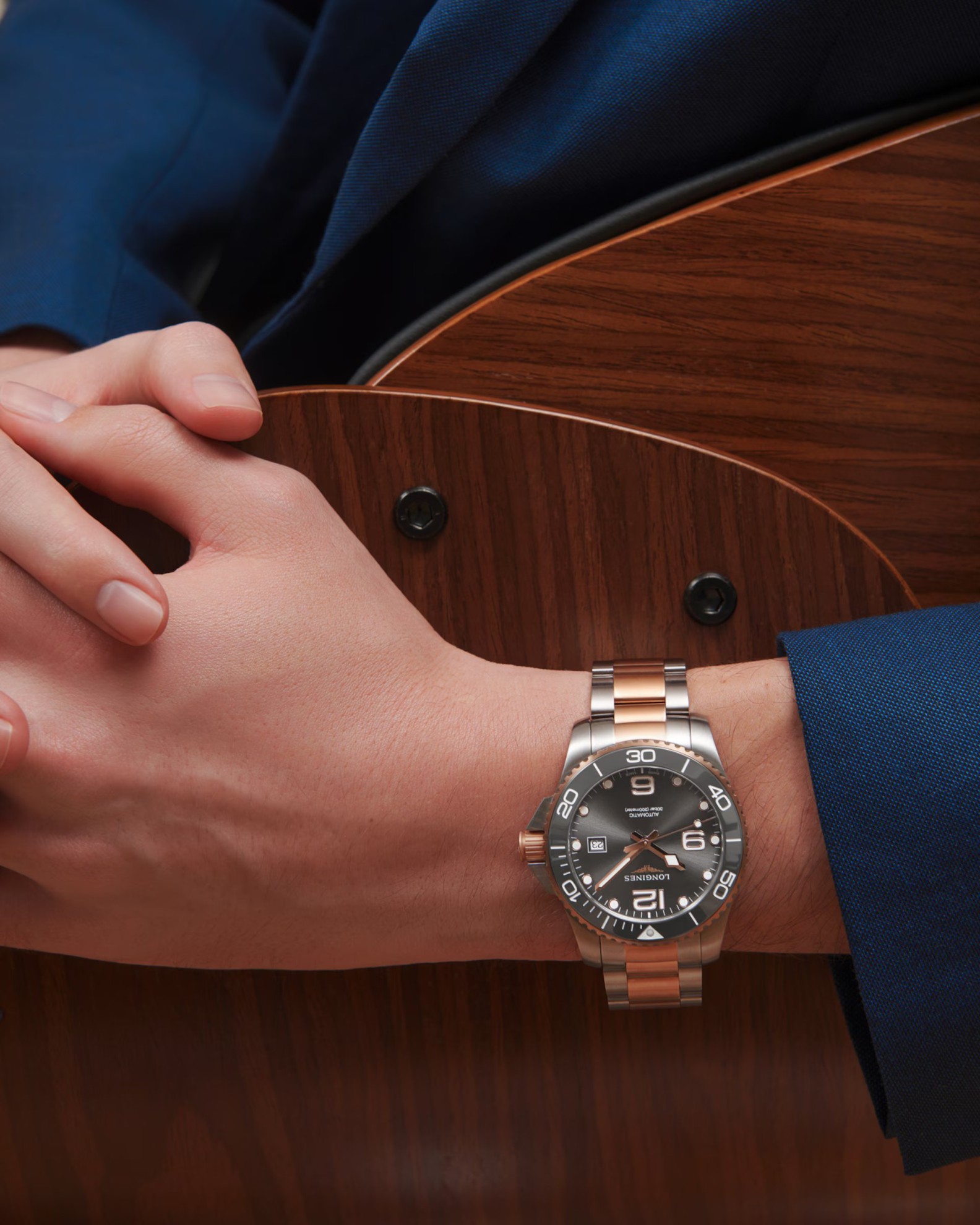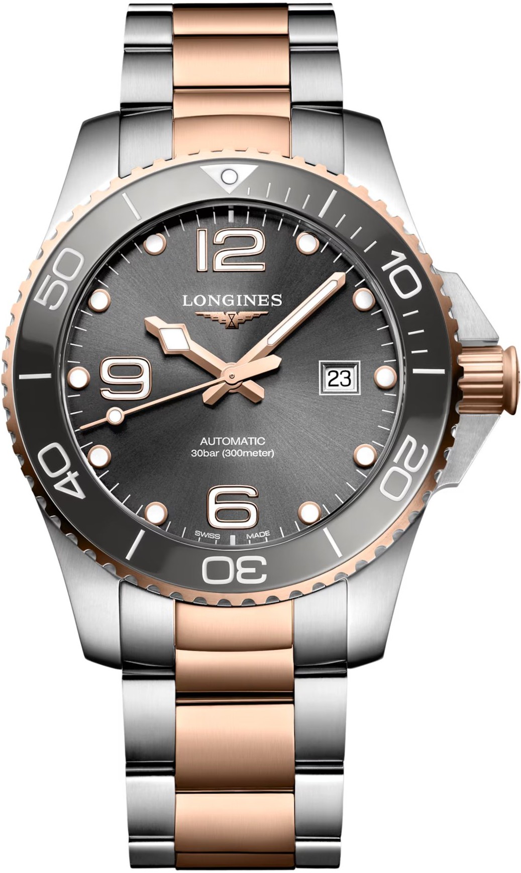 Longines HydroConquest L3.782.3.78.7 sind Herren-Taucheruhren mit Automatikwerk an einem zweifarbigen Edelstahlarmband mit Faltschließe. Das Gehäuse aus Edelstahl hat einen Durchmesser von 43 Millimetern, eine gebürstete Oberfläche, eine verschraubte Krone und eine einseitig drehbare Lünette mit grauer Keramikeinlage. Die mittleren Glieder des Armbands, die Lünette und die Krone sind mit einer PVD-Beschichtung in Roségold versehen. Das graue Zifferblatt mit Sonnenschliff und Datumsanzeige auf der Drei-Uhr-Position wird durch Saphirglas mit beidseitiger Antireflexbeschichtung geschützt. Aufgetragene Stundenindizes, Zeiger und Punkt auf der Lünette sind mit Super-LumiNova® Leuchtmasse überzogen, die nach dem Aufladen perfekte Ablesbarkeit bei schlechten Lichtverhältnissen garantiert. Der Uhrbetrieb wird durch das mechanische Kaliber L888 mit Automatikaufzug und einer Gangreserve von etwa 72 Stunden gewährleistet. Dieses Kaliber mit der Funktion des Sekundenstoppes beim Herausziehen der Krone in die äußerste Position, bekannt als Hacking, kann bei Bedarf auch manuell aufgezogen werden. Das Kaliber ist mit einer Siliziumspirale ausgestattet, die der Uhr eine hohe Resistenz gegen Magnetfelder verleiht. Die Uhr mit einer Wasserdichtigkeit von 30 ATM ist für das Tiefseetauchen geeignet.