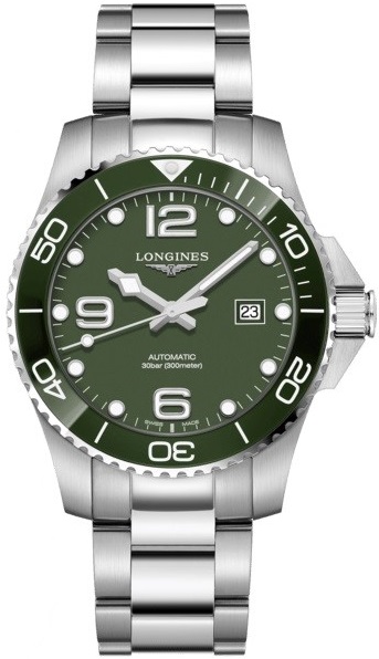 Longines HydroConquest L3.782.4.06.6 sind Herren-Taucheruhren mit automatischem Aufzug und einem Edelstahlarmband mit Faltschließe. Das Edelstahlgehäuse hat einen Durchmesser von 43 Millimetern, eine gebürstete Oberfläche, eine verschraubte Krone und eine einseitig drehbare Lünette mit grüner Keramikeinlage. Das grüne Zifferblatt mit Datumsanzeige auf der Drei-Uhr-Position wird durch ein Saphirglas mit beidseitiger Antireflexbeschichtung geschützt. Die applizierten Stundenindizes, Zeiger und der Punkt auf der Lünette sind mit einer Leuchtbeschichtung Super-LumiNova® versehen, die nach Beleuchtung perfekte Ablesbarkeit bei schlechten Lichtverhältnissen garantiert. Das Uhrwerk wird durch ein mechanisches Kaliber L888 mit automatischem Aufzug und einer Gangreserve von etwa 72 Stunden angetrieben. Dieses Uhrwerk mit Sekundenstoppfunktion beim Herausziehen der Krone in die äußerste Position, bekannt als Hacking, kann bei Bedarf auch manuell aufgezogen werden. Das Kaliber ist mit einer Siliziumspirale ausgestattet, die den Uhren eine hohe Resistenz gegen Magnetfelder verleiht. Die Uhren mit einer Wasserdichtigkeit von 30 ATM sind für das Tiefseetauchen geeignet.