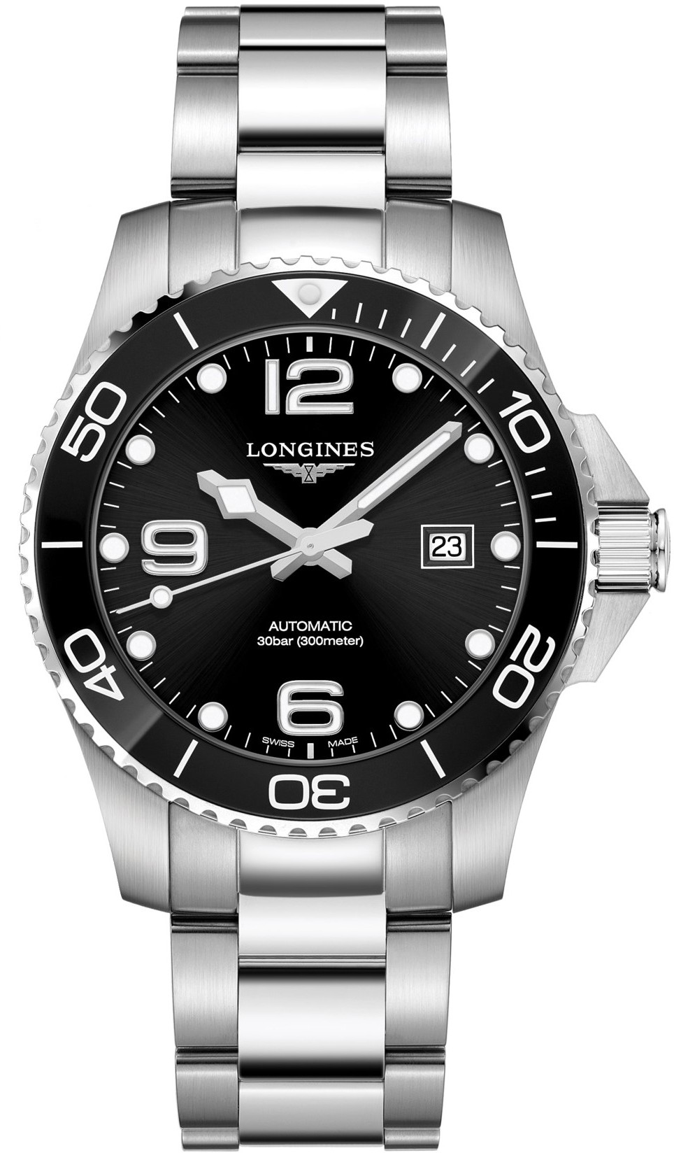 Longines HydroConquest L3.782.4.56.6 sind Herren-Taucheruhren mit Automatikwerk und einem Stahlarmband mit Faltschließe. Das Edelstahlgehäuse hat einen Durchmesser von 43 Millimetern, eine gebürstete Oberfläche, eine verschraubte Krone und eine einseitig drehbare Lünette mit schwarzer Keramikeinlage. Das schwarze Zifferblatt mit Sonnenschliff und Datumsanzeige auf der Drei-Uhr-Position wird durch ein saphirglas mit beidseitiger Antireflexbeschichtung geschützt. Die aufgetragenen Stundenindizes, Zeiger und der Punkt auf der Lünette sind mit einer lumineszierenden Beschichtung Super-LumiNova® versehen, die nach dem Aufladen eine perfekte Ablesbarkeit bei schlechten Lichtverhältnissen garantiert. Der Antrieb der Uhr wird durch ein mechanisches Uhrwerk L888 mit automatischem Aufzug und einer Gangreserve von etwa 72 Stunden gewährleistet. Dieses Uhrwerk mit der Funktion des Anhaltens des Sekundenzeigers beim Herausziehen der Krone in die äußerste Position, bekannt als Hacking, kann bei Bedarf auch manuell aufgezogen werden. Das Kaliber ist mit einer Siliziumspirale ausgestattet, die der Uhr eine hohe Widerstandsfähigkeit gegen Magnetfelder verleiht. Die Uhr mit einer Wasserdichtigkeit von 30 ATM ist für das Tiefseetauchen geeignet.