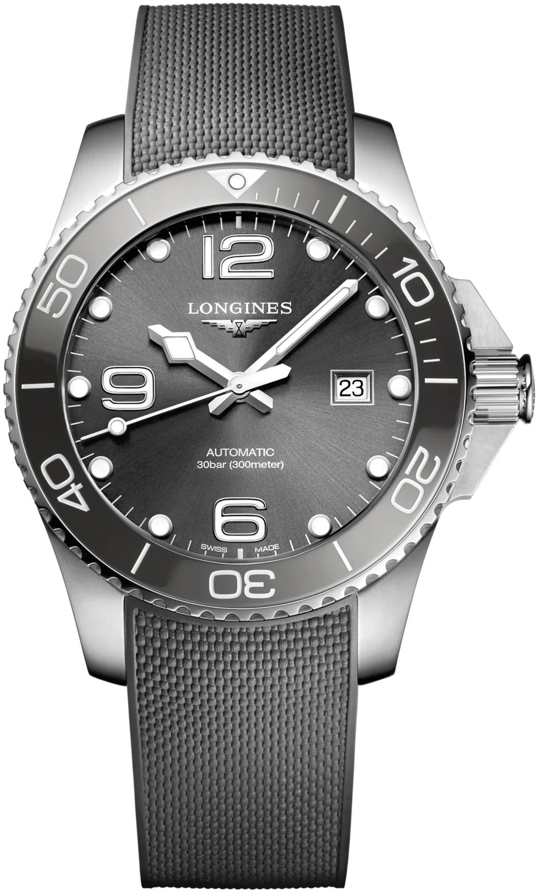 Longines HydroConquest L3.782.4.76.9 sind Herren-Taucheruhren mit einem grauen Kautschukarmband und einer Faltschließe. Das Edelstahlgehäuse hat einen Durchmesser von 43 Millimetern, eine gebürstete Oberfläche, eine verschraubte Krone und eine einseitig drehbare Lünette mit grauer Keramikeinlage. Das graue Zifferblatt mit Sonnenschliff-Effekt und Datumsanzeige auf der Drei-Uhr-Position ist durch ein Saphirglas mit beidseitiger Antireflexbeschichtung geschützt. Aufgetragene Stundenindizes, Zeiger und Punkt auf der Lünette sind mit einer lumineszierenden Beschichtung Super-LumiNova® versehen, die nach dem Aufladen perfekte Ablesbarkeit bei schlechten Lichtverhältnissen garantiert. Der Antrieb der Uhr wird durch das mechanische Kaliber L888 mit automatischem Aufzug und einer Gangreserve von etwa 72 Stunden gewährleistet. Dieses Kaliber mit der Funktion des Anhaltens des Sekundenzeigers beim Herausziehen der Krone in die äußerste Position, bekannt als Hacking, kann bei Bedarf auch manuell aufgezogen werden. Der Kaliber ist mit einer Siliziumspirale ausgestattet, die der Uhr eine hohe Widerstandsfähigkeit gegen Magnetfelder verleiht. Die Uhr mit einer Wasserdichtigkeit von 30 ATM ist für das Tiefseetauchen geeignet.