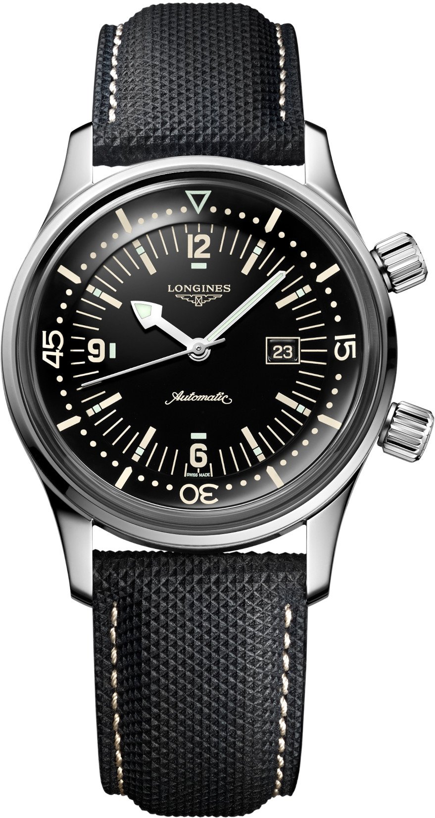 Longines Legend Diver L3.374.4.50.0 sind Unisex-Taucheruhren mit einem schwarzen Textilarmband mit kontrastierenden Nähten und einer Dornschließe. Das Gehäuse aus Edelstahl, das gebürstete und polierte Flächen kombiniert, hat einen Durchmesser von 36 Millimetern. Die verschraubte Krone auf der 4-Uhr-Position dient zur Zeiteinstellung, während die Krone auf der 2-Uhr-Position zur Einstellung der drehbaren Lünette verwendet wird. Das schwarze lackierte Zifferblatt mit Datumsanzeige auf der 3-Uhr-Position wird durch ein Saphirglas mit Antireflexbeschichtung geschützt. Die Stundenindizes und Zeiger sind mit einem Leuchtanstrich Super-LumiNova® versehen, der nach Aufladung eine perfekte Ablesbarkeit bei schlechten Lichtverhältnissen garantiert. Der Antrieb der Uhr erfolgt durch ein mechanisches Kaliber L592 mit automatischem Aufzug und einer Gangreserve von etwa 45 Stunden. Das Kaliber ist mit einer Siliziumspirale ausgestattet, die der Uhr eine hohe Resistenz gegen Magnetfelder verleiht. Mit einer Wasserdichtigkeit von 300 Metern sind die Uhren für das Tieftauchen geeignet.