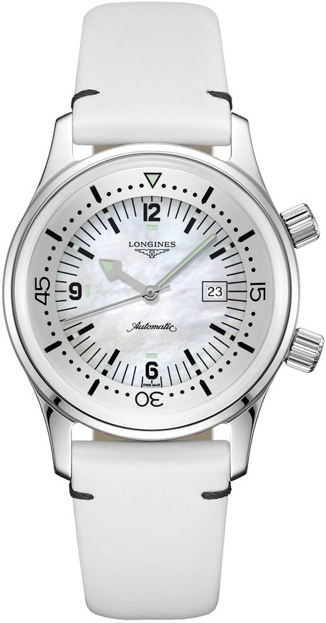 Longines Legend Diver L3.374.4.80.0 sind Damen-Taucheruhren mit einem weißen Lederarmband und einer Dornschließe. Das Gehäuse aus Edelstahl, das gebürstete und polierte Flächen kombiniert, hat einen Durchmesser von 36 Millimetern. Die verschraubte Krone auf der 4-Uhr-Position dient zur Zeiteinstellung, während die Krone auf der 2-Uhr-Position zur Einstellung der drehbaren Lünette verwendet wird. Das Perlmuttzifferblatt mit Datumsanzeige auf der 3-Uhr-Position wird durch ein Saphirglas mit Antireflexbeschichtung geschützt, und seine Schönheit kommt besonders bei direktem Licht zur Geltung, wenn das Farbspiel des Perlmutts beobachtet werden kann. Die Stundenindizes und Zeiger sind mit einem Leuchtanstrich Super-LumiNova® versehen, der nach Aufladung eine perfekte Ablesbarkeit bei schlechten Lichtverhältnissen garantiert. Der Antrieb der Uhr erfolgt durch ein mechanisches Kaliber L592 mit automatischem Aufzug und einer Gangreserve von etwa 45 Stunden. Das Kaliber ist mit einer Siliziumspirale ausgestattet, die der Uhr eine hohe Resistenz gegen Magnetfelder verleiht. Mit einer Wasserdichtigkeit von 300 Metern sind die Uhren für das Tieftauchen geeignet.