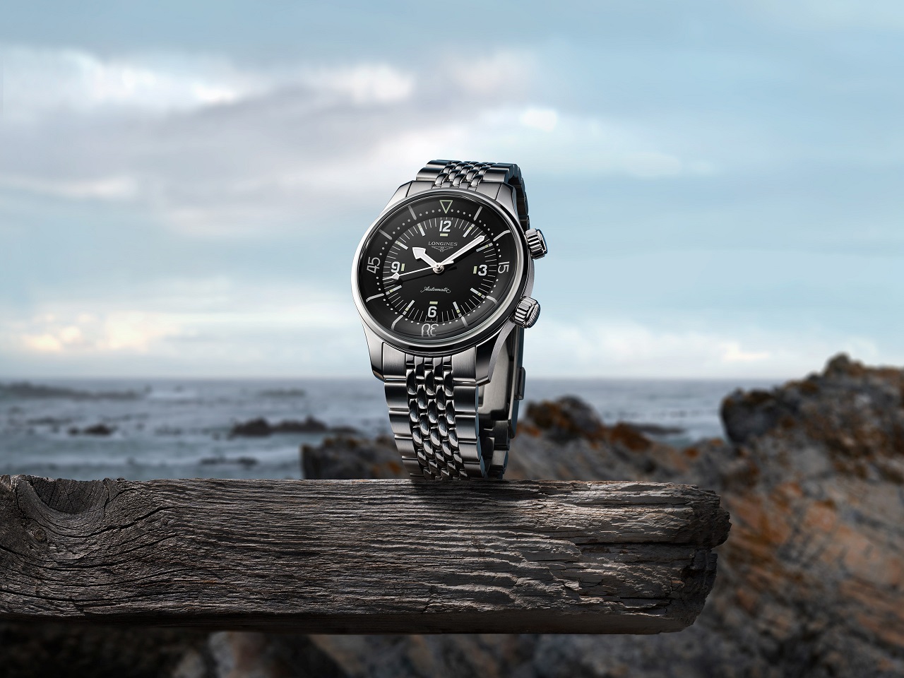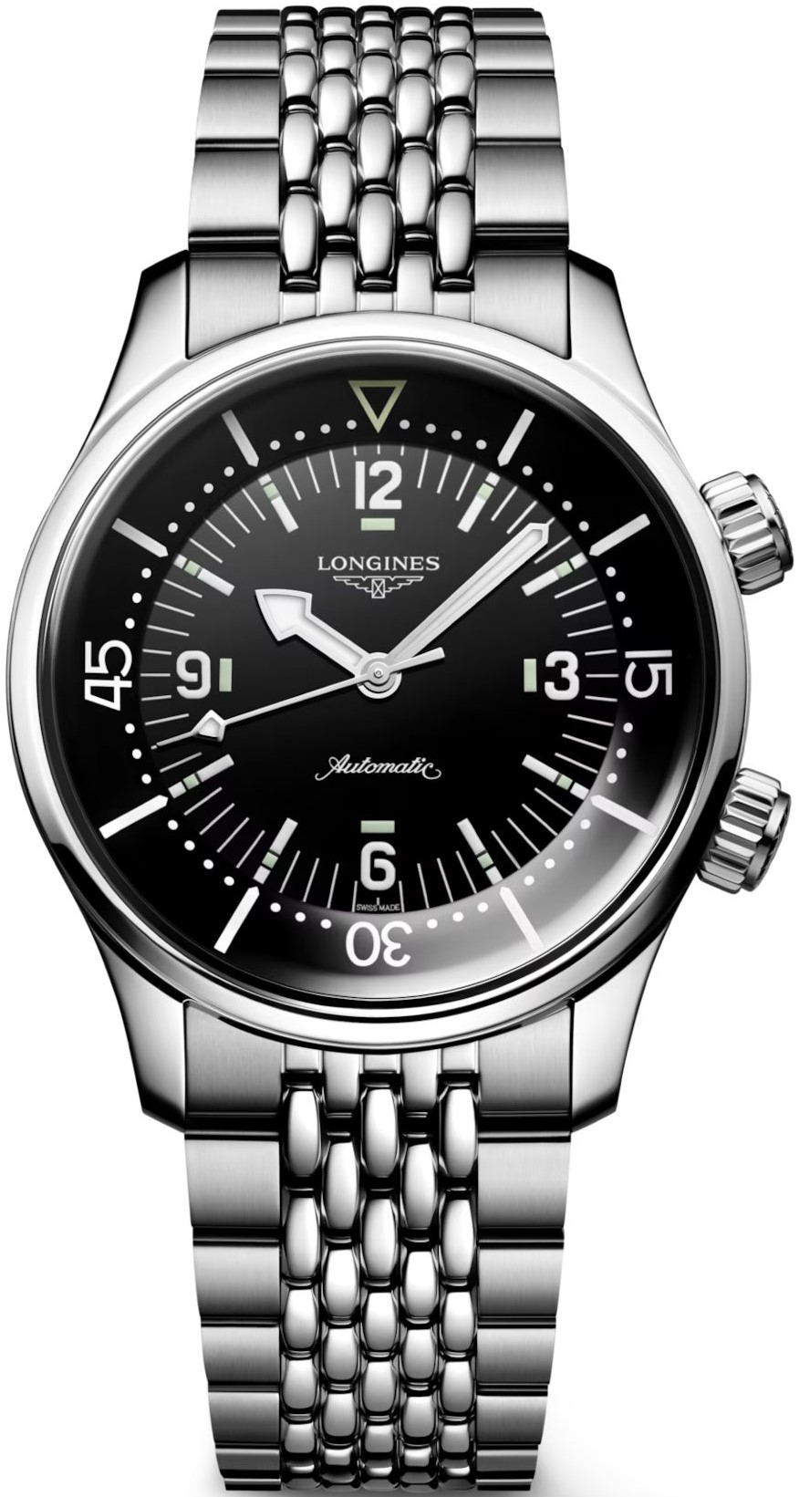 Longines Legend Diver L3.764.4.50.6 sind Herren Taucheruhren mit einem Stahlarmband vom Typ Beads of Rice mit Faltschließe, das seinen Namen erhielt, weil seine mittleren Glieder Reiskörner ähneln. Das Edelstahlgehäuse, das gebürstete und polierte Flächen kombiniert, hat einen Durchmesser von 39 Millimetern. Die verschraubte Krone auf der 4-Uhr-Position dient zur Zeiteinstellung, während die Krone auf der 2-Uhr-Position zur Einstellung der drehbaren Lünette dient. Das matte schwarze Zifferblatt ist durch ein Saphirglas mit beidseitiger Antireflexbeschichtung geschützt. Die Stundenindizes und Zeiger sind mit einem lumineszierenden Anstrich Super-LumiNova® versehen, der nach Beleuchtung perfekte Ablesbarkeit bei schlechten Lichtverhältnissen garantiert. Der Antrieb der Uhr wird durch das mechanische Kaliber L888 mit automatischem Aufzug und einer Gangreserve von etwa 72 Stunden gewährleistet. Dieses Kaliber mit der Funktion des Anhaltens des Sekundenzeigers beim Herausziehen der Krone in die äußerste Position, für die sich der Begriff Hacking eingebürgert hat, kann bei Bedarf auch manuell aufgezogen werden. Der Kaliber ist zudem mit einer Siliziumspirale ausgestattet, die der Uhr eine hohe Resistenz gegen Magnetfelder verleiht. Die Uhren mit C.O.S.C.-Zertifizierung, die eine Garantie für hohe Präzision ist, tragen die Bezeichnung Chronometer. Mit einer Wasserdichtigkeit von 300 Metern sind sie für das Tiefseetauchen geeignet.