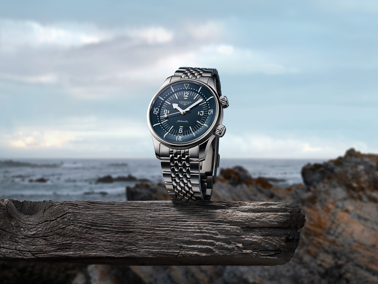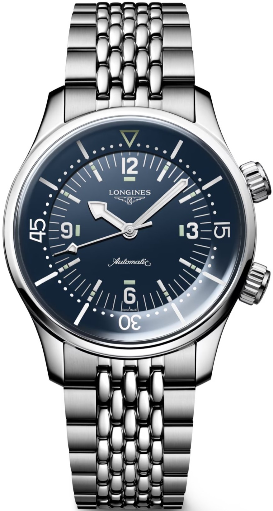 Longines Legend Diver L3.764.4.90.6 sind Herrentaucheruhren mit einem Edelstahlarmband im Beads-of-Rice-Stil mit Faltschließe, das seinen Namen aufgrund der mittleren Glieder, die an Reiskörner erinnern, erhielt. Das Gehäuse aus Edelstahl, das gebürstete und polierte Flächen kombiniert, hat einen Durchmesser von 39 Millimetern. Die verschraubte Krone auf der 4-Uhr-Position dient zur Zeiteinstellung, während die Krone auf der 2-Uhr-Position zur Einstellung der drehbaren Lünette verwendet wird. Das matte blaue Zifferblatt wird durch ein Saphirglas mit beidseitiger Antireflexbeschichtung geschützt. Stundenindizes und Zeiger sind mit einem lumineszierenden Anstrich Super-LumiNova® versehen, der nach dem Aufladen perfekte Ablesbarkeit bei schlechten Lichtverhältnissen garantiert. Der Antrieb der Uhr wird durch ein mechanisches Kaliber L888 mit automatischem Aufzug und einer Gangreserve von etwa 72 Stunden gewährleistet. Dieses Uhrwerk mit der Funktion des Anhaltens des Sekundenzeigers beim Herausziehen der Krone in die äußerste Position, bekannt als Hacking, kann bei Bedarf auch manuell aufgezogen werden. Das Kaliber ist zudem mit einer Siliziumspirale ausgestattet, die der Uhr eine hohe Resistenz gegen Magnetfelder verleiht. Die Uhr mit C.O.S.C.-Zertifizierung, die hohe Präzision garantiert, trägt die Bezeichnung Chronometer. Mit einer Wasserdichtigkeit von 300 Metern ist sie für das Tiefseetauchen geeignet.