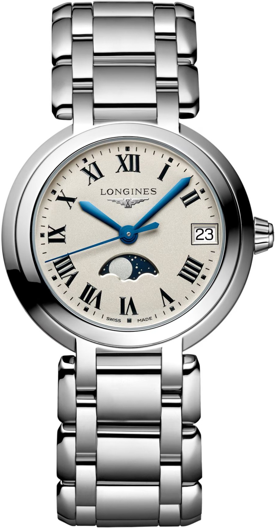 Longines PrimaLuna L8.115.4.71.6 sind Damen-Quarzuhren im klassischen Stil mit einem Edelstahlarmband mit polierter Oberfläche und Faltschließe. Das Gehäuse aus Edelstahl hat einen Durchmesser von 30,5 Millimetern. Das weiße Zifferblatt mit Datumsanzeige und Mondphasenanzeige wird durch ein widerstandsfähiges saphirglas mit Antireflexbeschichtung geschützt. Das Uhrwerk wird von einem Quarzwerk L296 mit Batteriestandsanzeige angetrieben. Mit einer Wasserdichtigkeit von 3 ATM sind die Uhren regen- und spritzwassergeschützt.