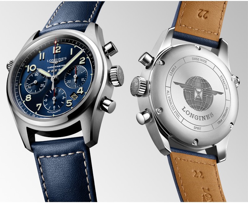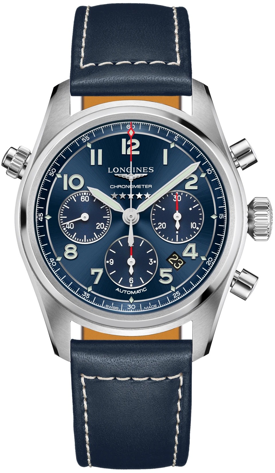 Longines Spirit Chronograph L3.820.4.93.0 sind sportlich elegante Herren-Automatikuhr mit einem blauen Lederarmband mit kontrastierenden Nähten und Dornschließe. Das Edelstahlgehäuse hat einen Durchmesser von 42 Millimetern und eine verschraubte Krone. Das blaue Zifferblatt mit Sonnenschliff-Effekt, Datumsanzeige und Stoppuhr ist durch Saphirglas mit beidseitiger Antireflexbeschichtung geschützt. Zeiger und Indizes sind mit einer lumineszierenden Beschichtung Super-LumiNova® versehen, die nach dem Aufladen eine perfekte Ablesbarkeit bei schlechten Lichtverhältnissen garantiert. Der Antrieb der Uhr wird durch ein mechanisches Kaliber L688.4 mit automatischem Aufzug und einer Gangreserve von etwa 66 Stunden gewährleistet. Dieses Kaliber mit der Funktion des Anhaltens des Sekundenzeigers beim Herausziehen der Krone in die äußerste Position, bekannt als Hacking, kann bei Bedarf auch manuell aufgezogen werden. Das Kaliber ist mit einer Siliziumspirale ausgestattet, die der Uhr eine hohe Resistenz gegen Magnetfelder verleiht. Uhren mit C.O.S.C.-Zertifizierung, die eine hohe Genauigkeit garantieren, tragen die Bezeichnung „Chronometer“. Mit einer Wasserdichtigkeit von 10 ATM sind die Uhren zum Schwimmen und Schnorcheln geeignet.