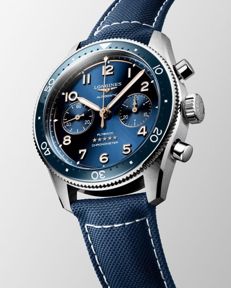 Longines Spirit Flyback L3.821.4.93.2 sind Herren-Sportuhren mit automatischem Antrieb an einem blauen Nylonarmband mit kontrastierenden Nähten, Faltschließe und einem System für einfachen Armbandwechsel. Das Edelstahlgehäuse hat einen Durchmesser von 42 Millimetern, eine verschraubte Krone und einen transparenten Boden. Das blaue Zifferblatt mit Sonnenschliff und zwei Stoppuhrzählern wird durch ein Saphirglas mit beidseitiger Antireflexbeschichtung geschützt. Zeiger und Indizes sind mit einer Leuchtbeschichtung Super-LumiNova® versehen, die nach dem Aufladen eine perfekte Ablesbarkeit bei schlechten Lichtverhältnissen garantiert. Der Antrieb der Uhr erfolgt durch ein mechanisches Werk L791 mit automatischem Aufzug und einer Gangreserve von etwa 68 Stunden. Dieses Werk mit Sekundenstoppfunktion beim Herausziehen der Krone in die äußerste Position, für die der Begriff Hacking gebräuchlich ist, kann bei Bedarf auch manuell aufgezogen werden. Das Kaliber ist mit einer Siliziumspirale ausgestattet, die der Uhr eine hohe Widerstandsfähigkeit gegen Magnetfelder verleiht. Die Flyback-Funktion ermöglicht das Stoppen, Zurücksetzen und Neustarten der Stoppuhr mit einem Knopfdruck. Die Uhr mit C.O.S.C.-Zertifizierung, die hohe Genauigkeit garantiert, trägt die Bezeichnung „Chronometer“. Mit einer Wasserdichtigkeit von 10 ATM sind die Uhren für Schwimmen und Schnorcheln geeignet.