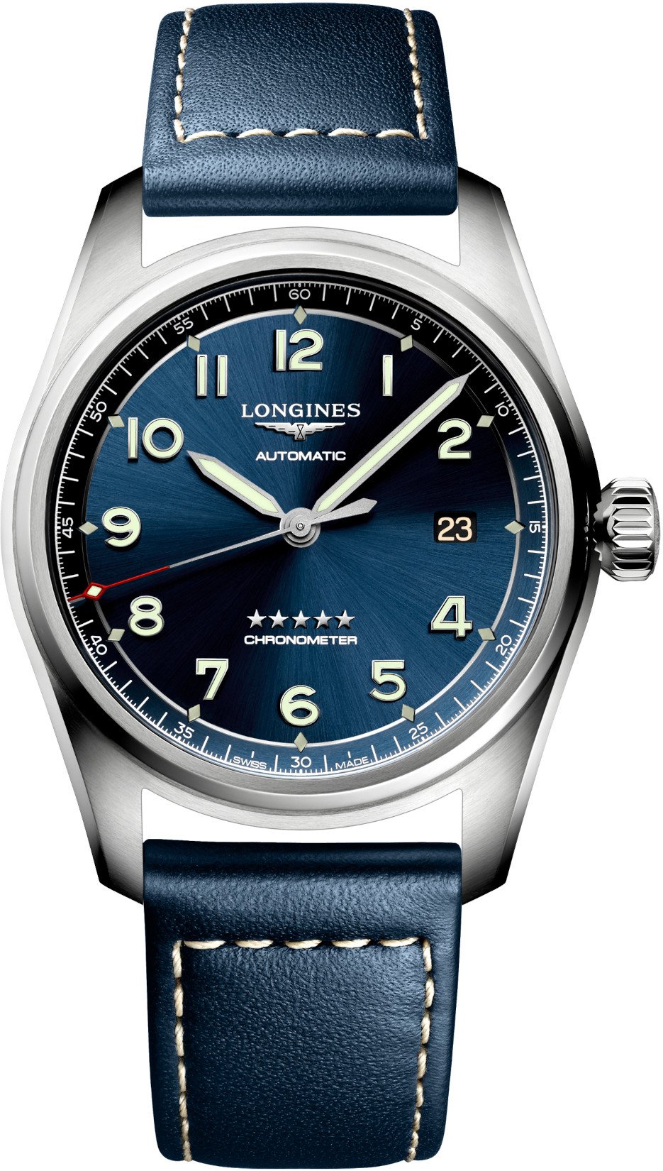 Longines Spirit L3.810.4.93.0 sind elegante automatische unisex Uhren mit einem blauen Lederarmband mit kontrastierenden Nähten und Dornschließe. Das Gehäuse aus Edelstahl hat einen Durchmesser von 40 Millimetern, eine gebürstete Oberfläche und eine verschraubte Krone. Das blaue Zifferblatt mit Sonnenschliff-Effekt und Datumsanzeige auf der Drei-Uhr-Position wird durch Saphirglas mit beidseitiger Antireflexbeschichtung geschützt. Die Zeiger und Indizes sind mit einer lumineszierenden Beschichtung Super-LumiNova® versehen, die nach dem Aufladen eine perfekte Ablesbarkeit bei schlechten Lichtverhältnissen garantiert. Der Antrieb der Uhr wird durch ein mechanisches Kaliber L888.4 mit automatischem Aufzug und einer Gangreserve von ca. 72 Stunden gewährleistet. Dieses Kaliber mit der Funktion des Anhaltens des Sekundenzeigers beim Herausziehen der Krone in die äußerste Position, bekannt als Hacking, kann bei Bedarf auch manuell aufgezogen werden. Das Kaliber ist mit einer Silizium-Spiralfeder ausgestattet, die der Uhr eine hohe Widerstandsfähigkeit gegen Magnetfelder verleiht. Die Uhr mit C.O.S.C.-Zertifizierung, die eine hohe Genauigkeit garantiert, trägt die Bezeichnung „Chronometer“. Mit einer Wasserdichtigkeit von 10 ATM ist die Uhr für Schwimmen und Schnorcheln geeignet.