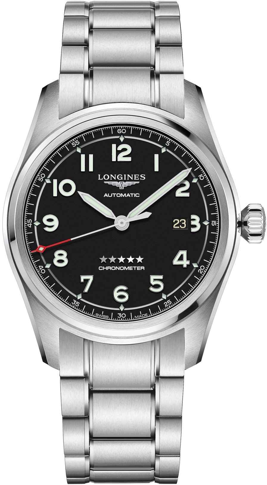 Longines Spirit Prestige Edition L3.811.4.53.9 sind Herrenuhren im klassischen Stil mit einem Stahlarmband und einer Faltschließe. Das Edelstahlgehäuse hat einen Durchmesser von 42 Millimetern, eine gebürstete Oberfläche und eine verschraubte Krone. Das schwarze Zifferblatt mit Datumsanzeige bei drei Uhr wird durch ein Saphirglas mit beidseitiger Antireflexbeschichtung geschützt. Zeiger und Indizes sind mit einer lumineszierenden Beschichtung Super-LumiNova® versehen, die nach Beleuchtung eine perfekte Ablesbarkeit bei schlechten Lichtverhältnissen garantiert. Das Uhrwerk wird durch ein mechanisches Kaliber L888.4 mit automatischem Aufzug und einer Gangreserve von etwa 72 Stunden angetrieben. Dieses Uhrwerk mit der Funktion des Anhaltens des Sekundenzeigers beim Herausziehen der Krone in die äußerste Position, bekannt als Hacking, kann bei Bedarf auch manuell aufgezogen werden. Das Kaliber ist mit einer Siliziumspirale ausgestattet, die der Uhr eine hohe Widerstandsfähigkeit gegenüber Magnetfeldern verleiht. Die Uhr mit C.O.S.C.-Zertifizierung, die eine hohe Genauigkeit garantiert, trägt die Bezeichnung „Chronometer“. Mit einer Wasserdichtigkeit von 10 ATM ist die Uhr zum Schwimmen und Schnorcheln geeignet. Zwei zusätzliche braune Lederbänder sind im Lieferumfang enthalten.
