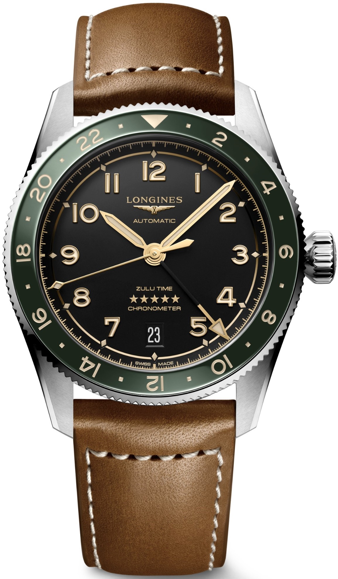 Longines Spirit Zulu Time L3.802.4.63.2 sind elegante Herren-Automatikuhr mit einem braunen Lederarmband mit kontrastierenden Nähten, Faltschließe und einem einfachen Armbandwechselsystem. Das Edelstahlgehäuse mit gebürsteter Oberfläche hat einen Durchmesser von 39 Millimetern, eine verschraubte Krone und eine GMT-Lünette mit grüner Keramikeinlage und 24-Stunden-Skala. Das schwarze Zifferblatt mit Datumsanzeige bei 6 Uhr und goldfarbener GMT-Zeiger wird durch ein saphirglas mit beidseitiger Antireflexbeschichtung geschützt. Die Zeiger und Indizes sind mit einer Leuchtbeschichtung Super-LumiNova® versehen, die nach dem Aufladen perfekte Ablesbarkeit bei schlechten Lichtverhältnissen garantiert. Das Uhrwerk wird durch ein mechanisches L844.4 Uhrwerk mit automatischem Aufzug und einer Gangreserve von ca. 72 Stunden angetrieben. Dieses Uhrwerk mit Sekundenstoppfunktion beim Herausziehen der Krone in die äußerste Position, bekannt als Hacking, kann bei Bedarf auch manuell aufgezogen werden. Das Kaliber ist mit einer Siliziumspirale ausgestattet, die der Uhr eine hohe Resistenz gegen Magnetfelder verleiht. Die Uhr mit C.O.S.C.-Zertifizierung, die hohe Präzision garantiert, trägt die Bezeichnung „Chronometer“. Mit einer Wasserdichtigkeit von 10 ATM ist die Uhr für Schwimmen und Schnorcheln geeignet.