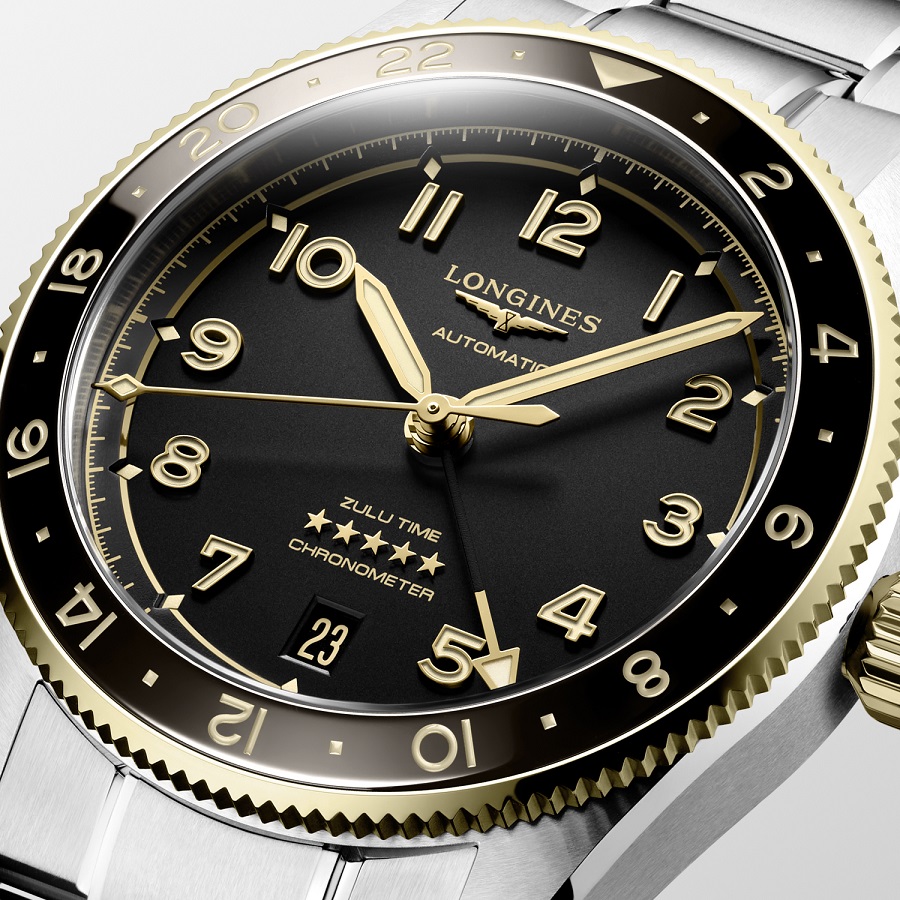 Longines Spirit Zulu Time L3.802.5.53.6 sind klassische Herren-Automatikuhr mit einem Stahlarmband, einer Faltschließe und einem einfachen Armbandwechselsystem. Das Edelstahlgehäuse mit gebürsteter Oberfläche hat einen Durchmesser von 39 Millimetern, eine verschraubte Krone und eine GMT-Lünette, die mit 18 Karat Gold vergoldet ist und eine schwarze Keramikeinlage mit 24-Stunden-Skala hat. Das schwarze Zifferblatt mit Datumsanzeige bei sechs Uhr und einem GMT-Zeiger in Goldfarbe ist durch Saphirglas mit beidseitiger Antireflexbeschichtung geschützt. Die Zeiger und Indizes sind mit einem lumineszierenden Anstrich Super-LumiNova® versehen, der nach dem Aufladen eine perfekte Ablesbarkeit bei schlechten Lichtverhältnissen garantiert. Das Uhrwerk wird durch ein mechanisches Kaliber L844.4 mit automatischem Aufzug und einer Gangreserve von etwa 72 Stunden angetrieben. Dieses Uhrwerk mit einer Sekundenstoppfunktion beim Herausziehen der Krone in die äußerste Position, bekannt als Hacking, kann bei Bedarf auch manuell aufgezogen werden. Das Kaliber ist mit einer Siliziumspirale ausgestattet, die der Uhr eine hohe Resistenz gegen Magnetfelder verleiht. Die Uhr mit C.O.S.C.-Zertifizierung, die hohe Präzision garantiert, trägt die Bezeichnung „Chronometer“. Mit einer Wasserdichtigkeit von 10 ATM ist die Uhr zum Schwimmen und Schnorcheln geeignet.