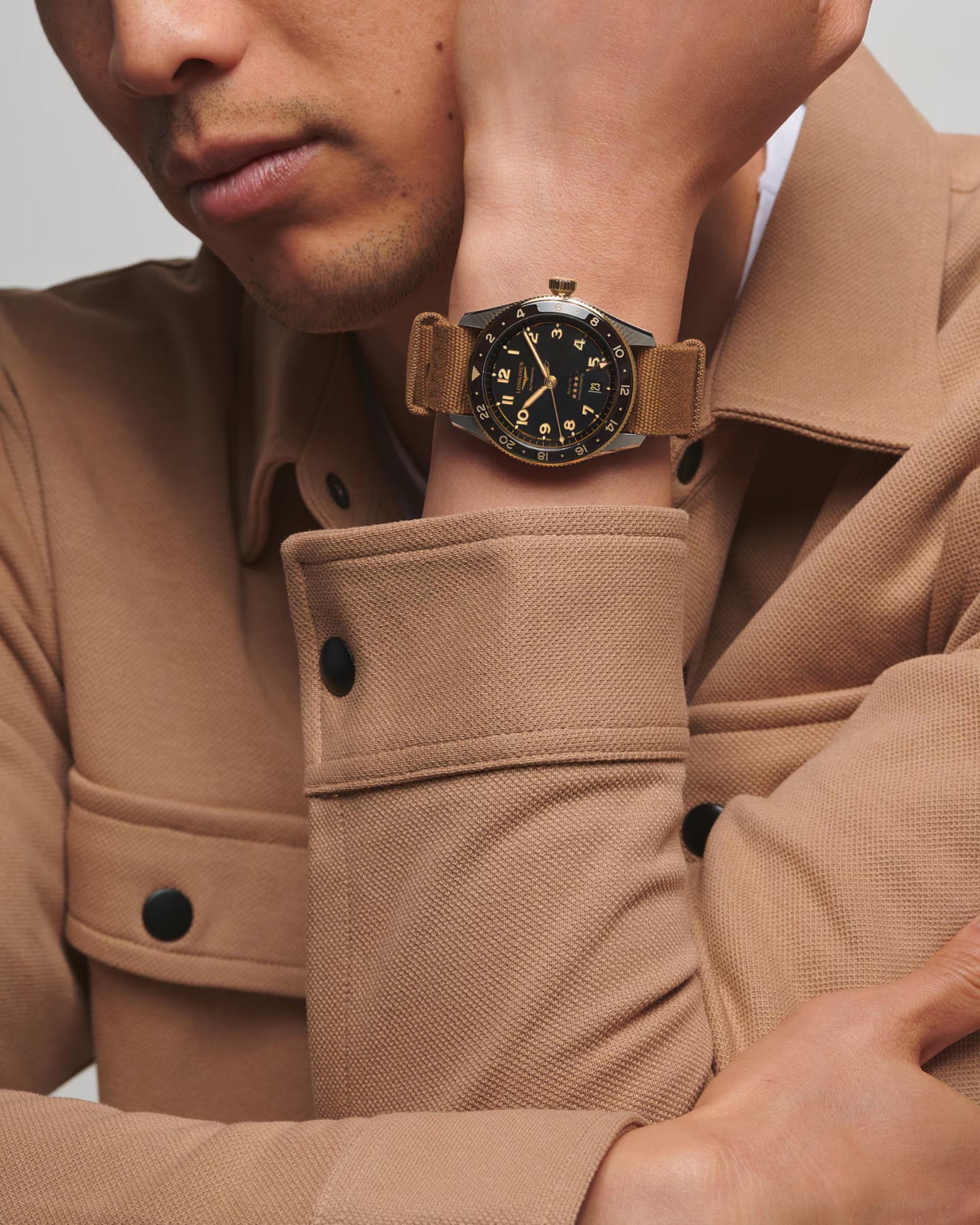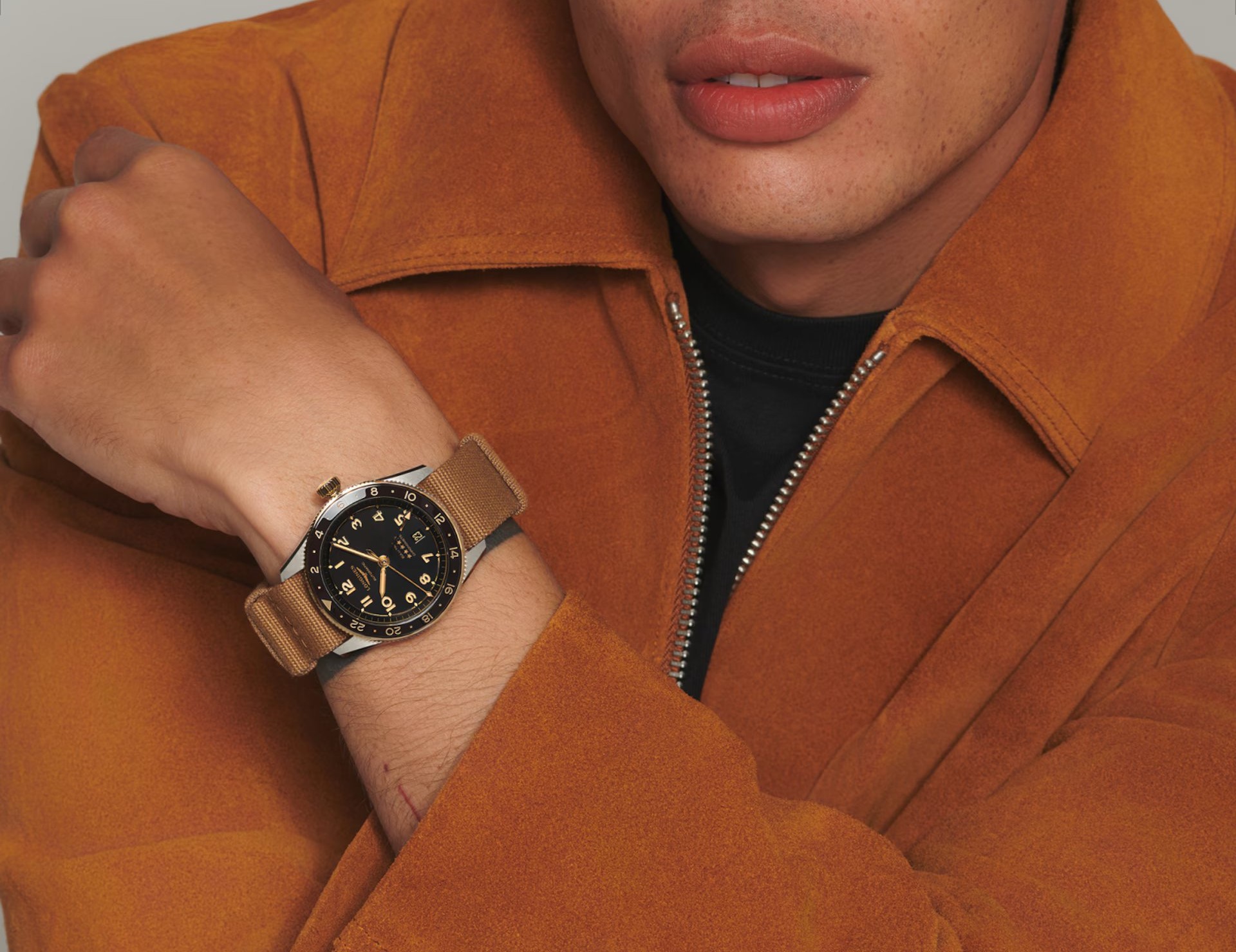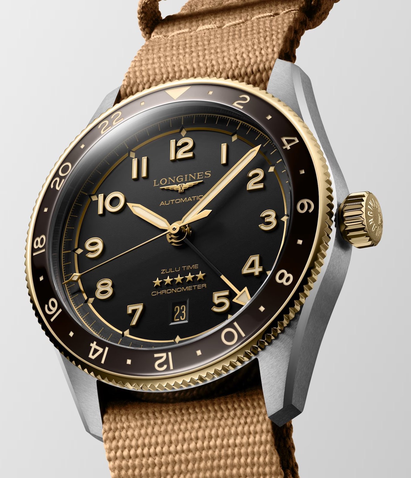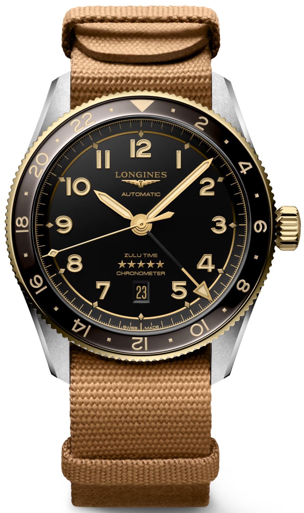 Longines Spirit Zulu Time L3.812.5.53.9 sind Herren-Automatikuhr an einem braunen NATO-Armband mit Dornschließe und einem System für den einfachen Austausch von Armbändern. Das Edelstahlgehäuse mit gebürsteter Oberfläche hat einen Durchmesser von 42 Millimetern, eine verschraubte Krone und eine GMT-Lünette, die mit 18-karätigem Gold vergoldet ist und eine schwarze Keramikeinlage mit 24-Stunden-Skala hat. Das schwarze Zifferblatt mit Datumsanzeige bei sechs Uhr und einem GMT-Zeiger in Goldfarbe wird durch Saphirglas mit beidseitiger Antireflexbeschichtung geschützt. Zeiger und Indizes sind mit einer Leuchtbeschichtung Super-LumiNova® versehen, die nach dem Aufladen perfekte Ablesbarkeit bei schlechten Lichtverhältnissen garantiert. Das Uhrwerk wird durch ein mechanisches Kaliber L844.4 mit automatischem Aufzug und einer Gangreserve von etwa 72 Stunden angetrieben. Dieses Kaliber mit der Funktion des Sekundenstoppes beim Herausziehen der Krone in die äußerste Position, bekannt als Hacking, kann bei Bedarf auch manuell aufgezogen werden. Das Kaliber ist mit einer Silizium-Spiralfeder ausgestattet, die der Uhr eine hohe Resistenz gegen Magnetfelder verleiht. Mit einer Wasserdichtigkeit von 10 ATM sind die Uhren für Schwimmen und Schnorcheln geeignet.