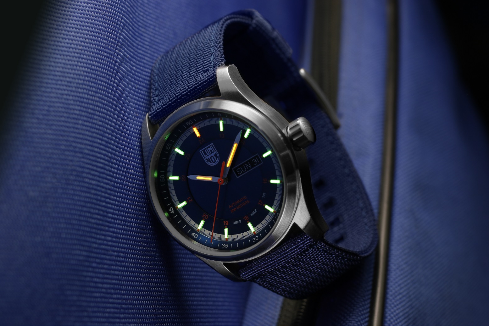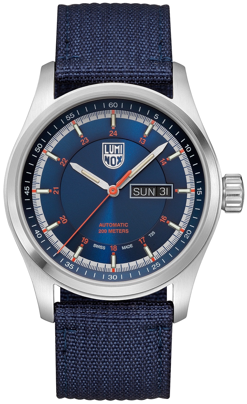 Luminox Atacama Field Automatic 1900 Series XL.1903 sind Herren-Automatikuhr mit einem blauen Nylonarmband mit Dornschließe. Das Edelstahlgehäuse hat einen Durchmesser von 44 Millimetern und eine verschraubte Krone. Das blaue Zifferblatt mit Sonnenschliff-Effekt, Datums- und Wochentagsanzeige sowie 24-Stunden-Anzeige wird durch ein robustes Saphirglas mit Antireflexbeschichtung geschützt. Die Zeiger und Indizes sind mit einem LLT-Leuchtanstrich versehen, der nach Beleuchtung die Lesbarkeit bei schlechten Lichtverhältnissen erleichtert. Das Uhrwerk wird von einem Schweizer mechanischen Uhrwerk SW220-1 mit automatischem Aufzug und einer Gangreserve von 38 Stunden angetrieben. Mit einer Wasserdichtigkeit von 20 ATM ist die Uhr für das Tieftauchen geeignet.