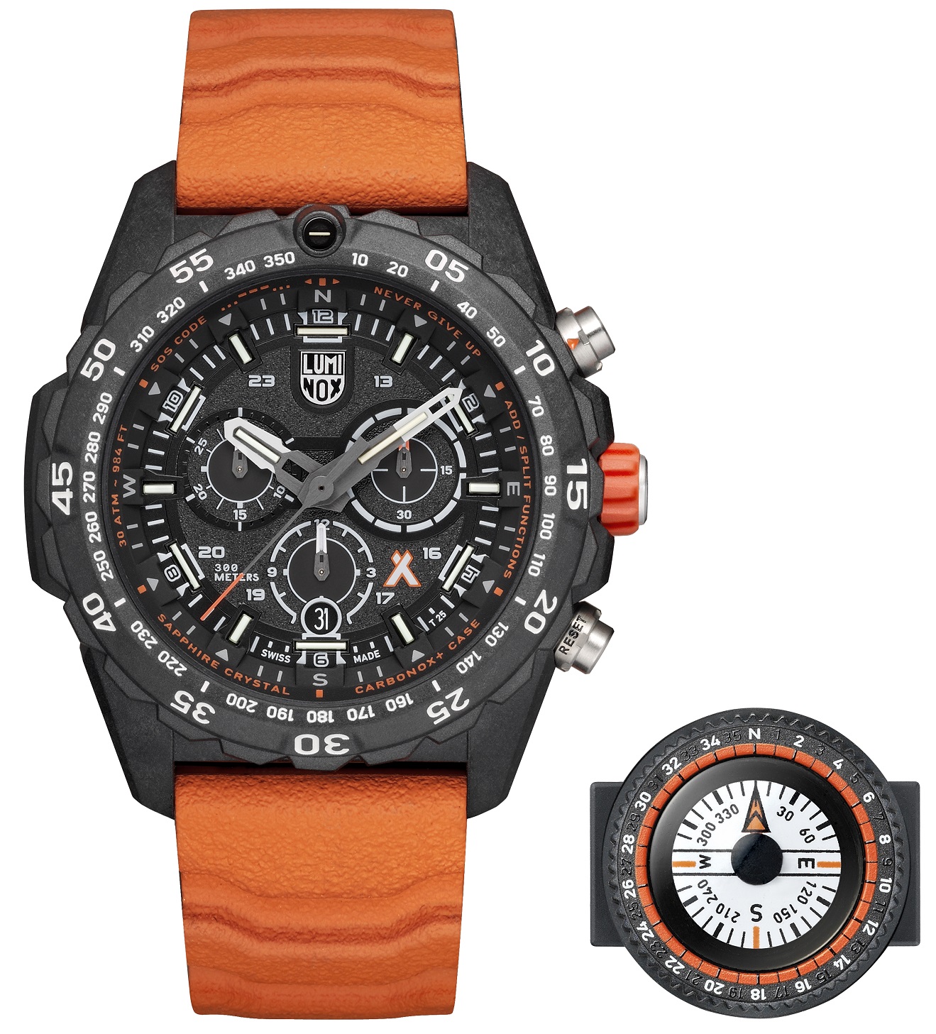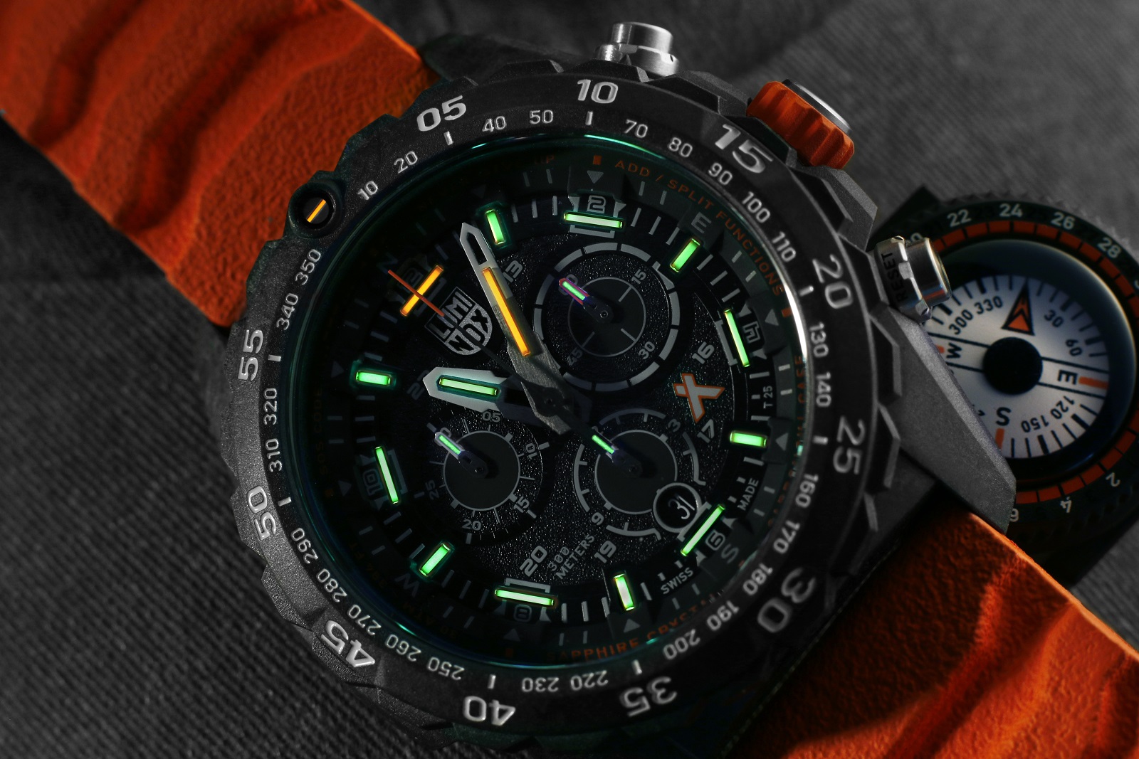 Luminox Bear Grylls Survival Master 3740 Series XB.3749 sind Herren-Batterieuhren mit einem orangefarbenen Kautschukarmband mit Kompass und Dornschließe. Das Gehäuse aus Carbon-Verbundwerkstoff CARBONOX™ hat einen Durchmesser von 45 Millimetern, eine verschraubte Krone und eine einseitig drehbare Lünette. Der Boden ist aus Edelstahl. Das schwarze Zifferblatt mit Datumsanzeige, Stoppuhr und 24-Stunden-Zeitformat wird durch ein widerstandsfähiges Saphirglas mit Antireflexbeschichtung geschützt. Die Zeiger, Indizes und der Punkt auf der Lünette sind mit einem LLT-Leuchtanstrich versehen, der nach Beleuchtung die Lesbarkeit bei schlechten Lichtverhältnissen erleichtert. Das Uhrwerk wird von einem Schweizer Quarzwerk Ronda 5030.D angetrieben. Mit einer Wasserdichtigkeit von 30 ATM sind die Uhren für das Gerätetauchen geeignet.