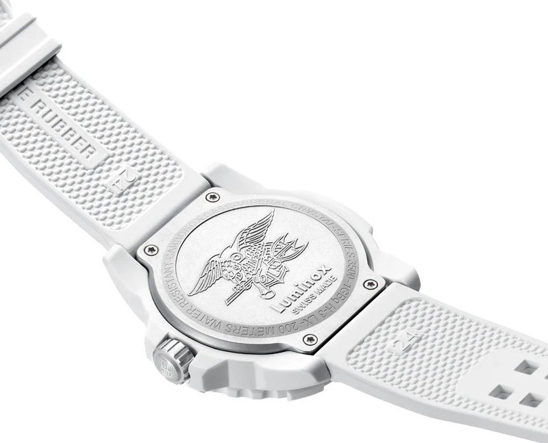 Luminox Navy SEAL 3500 Series XS.3507.WB sind Herren-Quarz-Sportuhren mit einem weißen Kautschukarmband und einer Dornschließe. Das Gehäuse aus Kunststoff und Carbon-Verbundwerkstoff CARBONOX™ hat einen Durchmesser von 45 Millimetern, eine einseitig drehbare Lünette, einen Stahlboden und eine verschraubte Krone. Das schwarze Zifferblatt mit Datumsanzeige und 24-Stunden-Zeitformat wird durch ein widerstandsfähiges Mineralglas geschützt. Die Zeiger, Indizes und der Punkt auf der Lünette sind mit Leuchtanstrich LLT versehen, der nach dem Aufladen die Ablesbarkeit bei schlechten Lichtverhältnissen erleichtert. Das Uhrwerk wird durch ein Schweizer Quarzwerk Ronda 515 mit einer Genauigkeit von -10/+20 Sekunden pro Monat angetrieben. Mit einer Wasserdichtigkeit von 20 ATM sind die Uhren für das Tieftauchen geeignet.